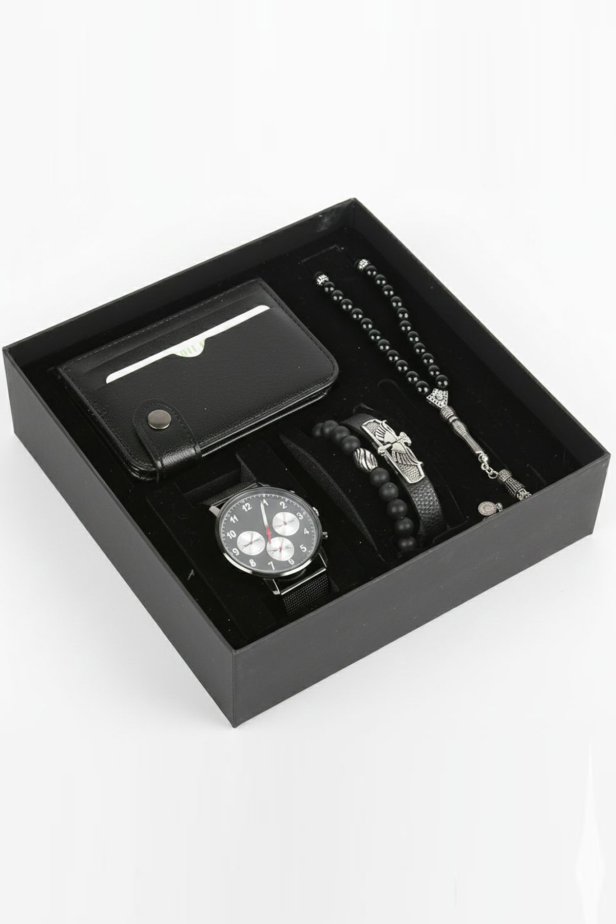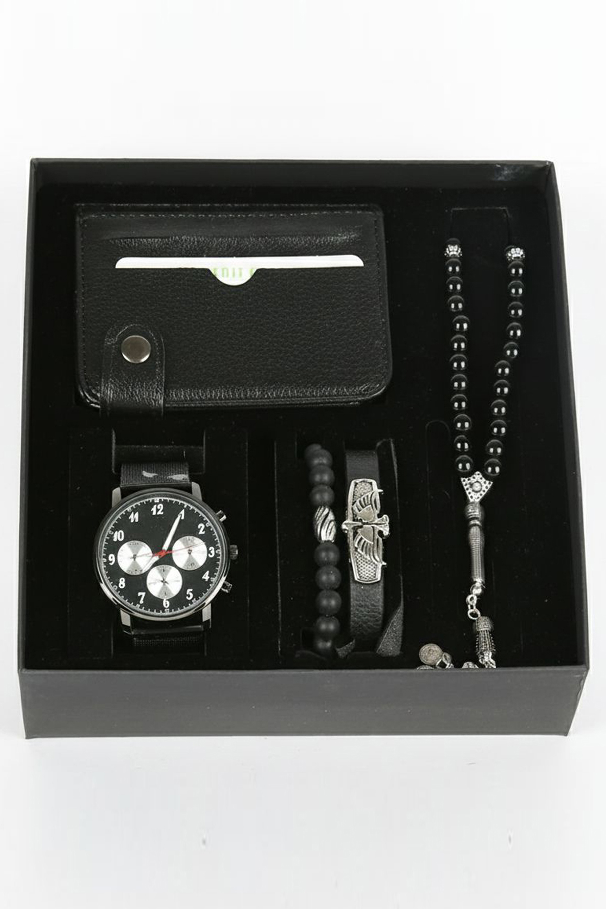 • 1 adet erkek kol saati, 1 adet cüzdan, 1 adet tesbih ve 2 adet bileklikten oluşmaktadır;