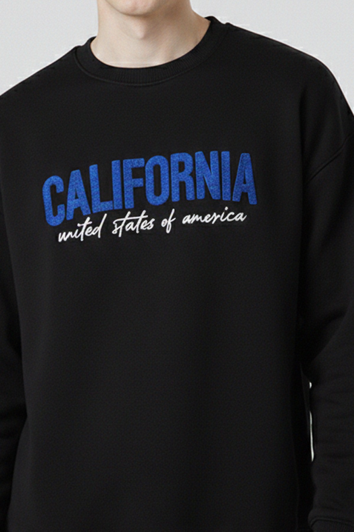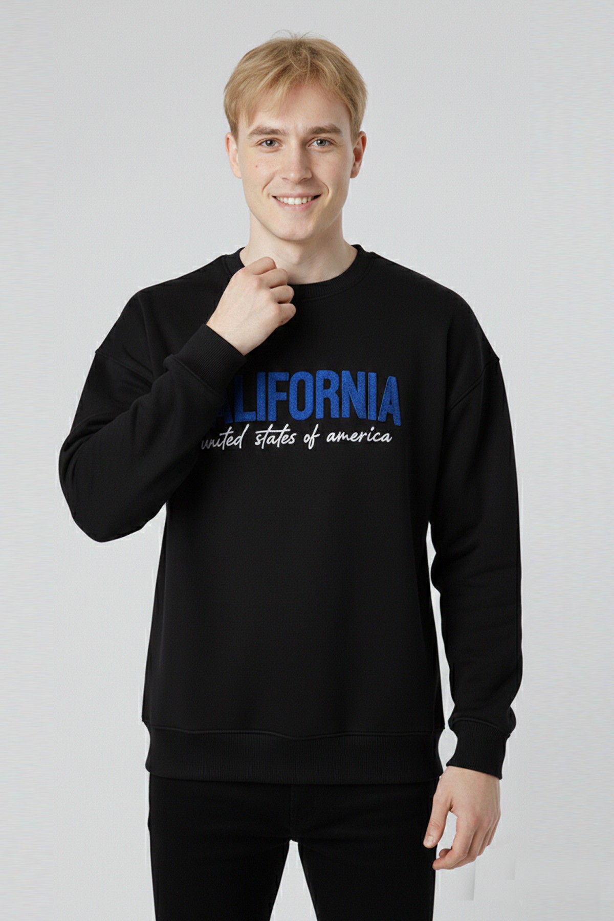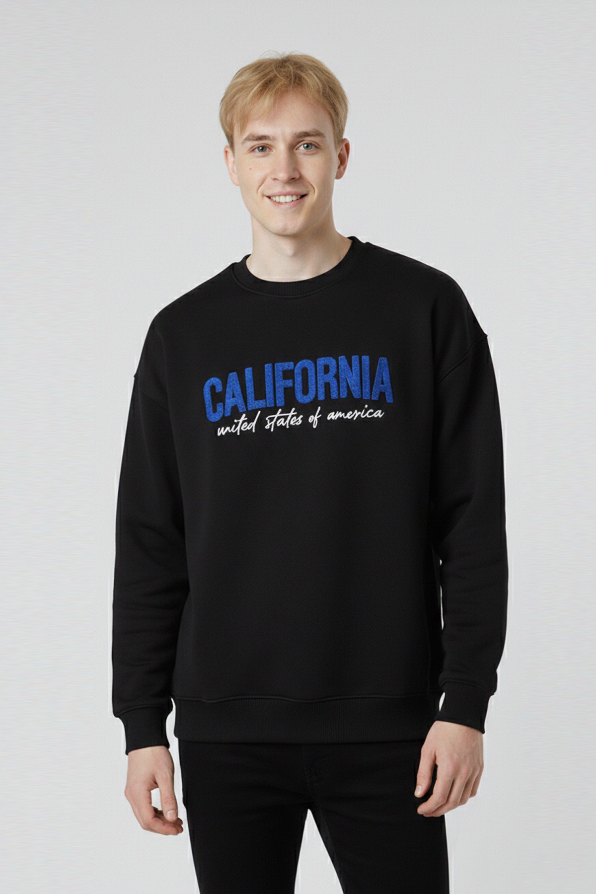 Erkek Siyah Oversize Bisiklet Yaka California Nakış Baskılı Pamuklu Sweatshirt