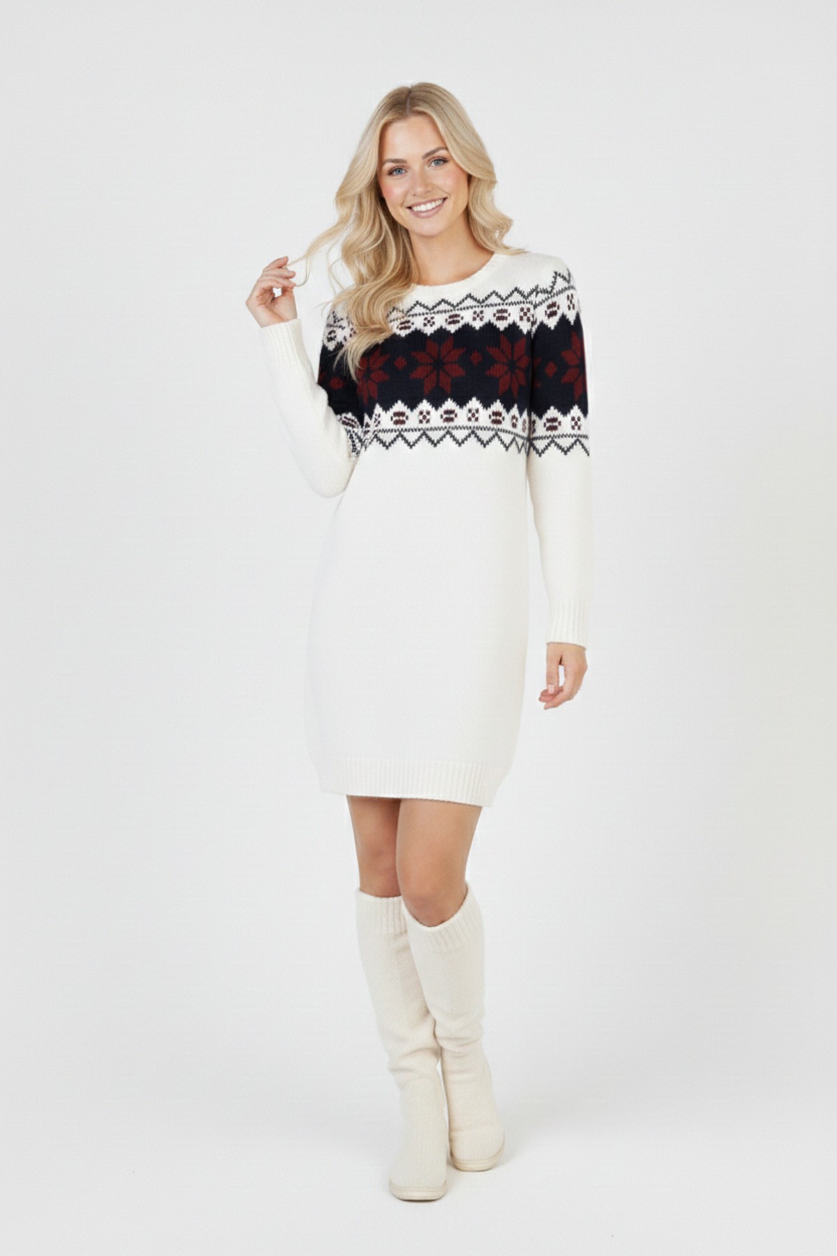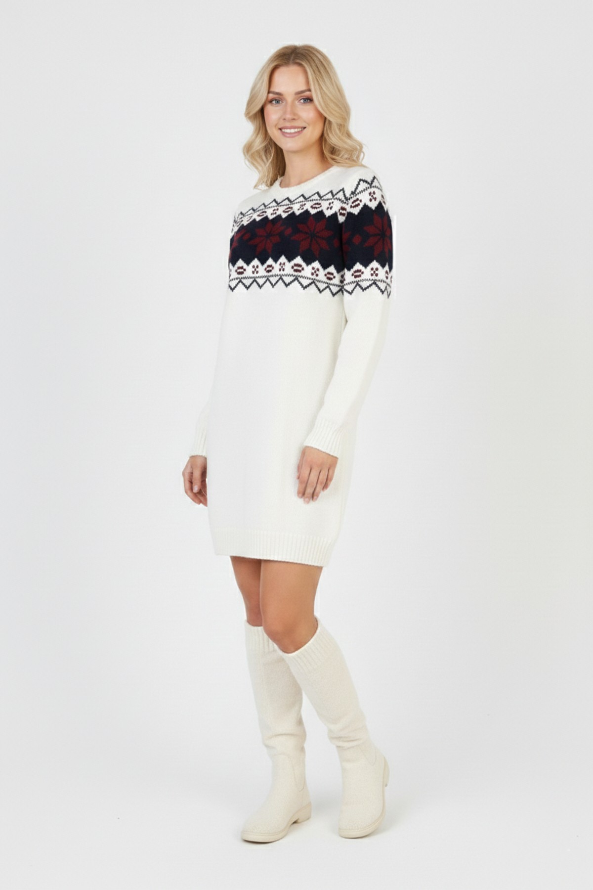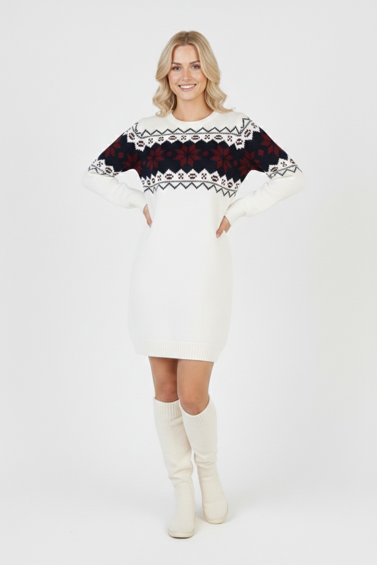 · Kadın beyaz bel desenli triko kazak elbise, zarif ve modern bir siluet sunar.;· Bisiklet yaka tasarımı sade şıklık sağlayarak günlük ve ofis stiline uyum gösterir.;· Standart kol kesimi rahat kullanım sunar ve gün boyu konfor destekler.;· Jakarlı örgü triko kumaşı dokulu yapısıyla kaliteli ve dikkat çekici durur.;· Yumuşak ve esnek triko dokusu cilt dostu yapısıyla rahat bir deneyim sağlar.;· Tek parça kombin kolaylığı sunan elbise, pratik ve şık bir tercihtir.;· Bot, çizme ve klasik ayakkabılarla uyumlu zamansız bir kışlık tasarımdır.;· Kadın triko elbise, desenli kazak elbise ve kışlık şık kombin arayanlar için idealdir.;