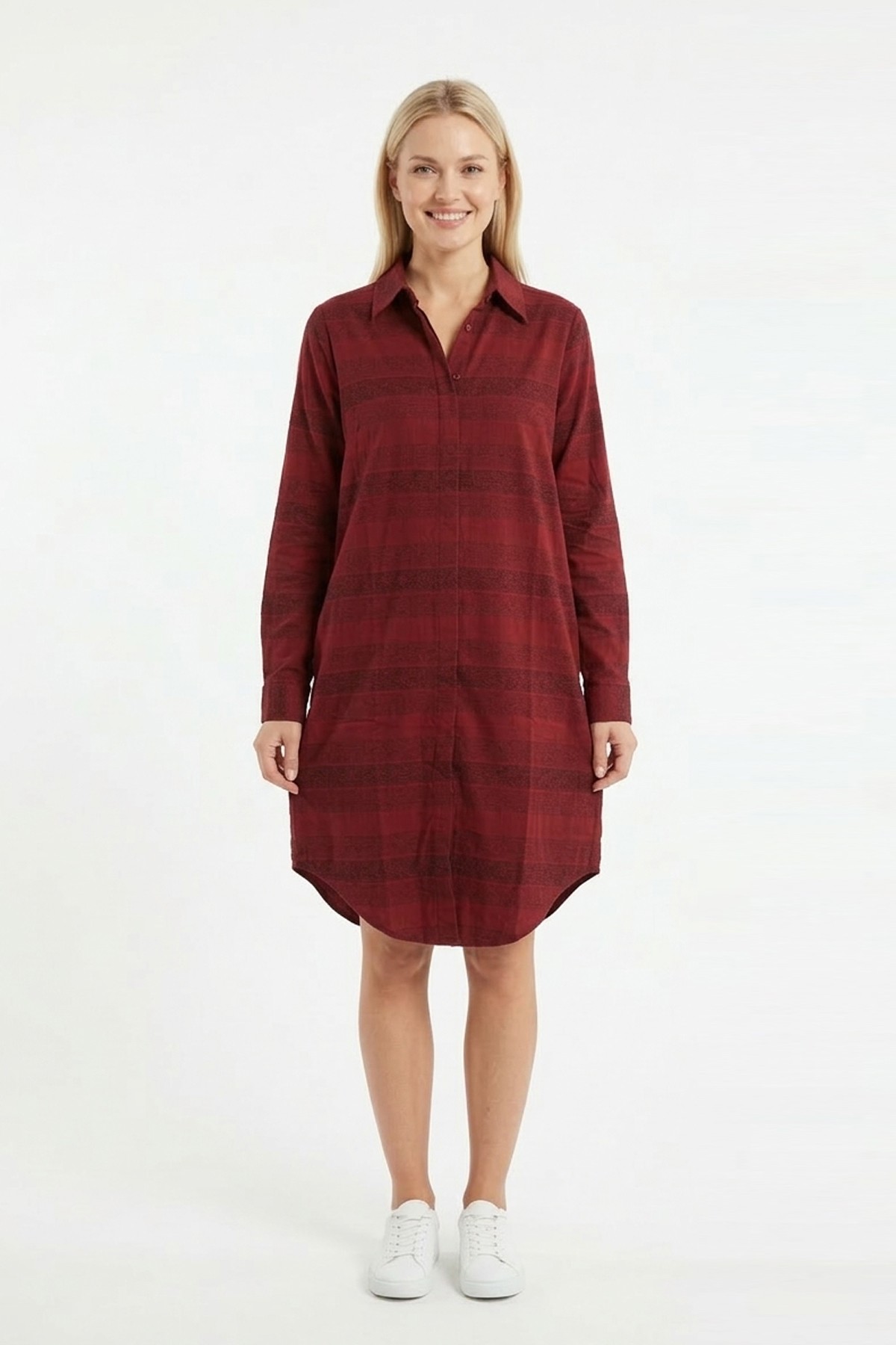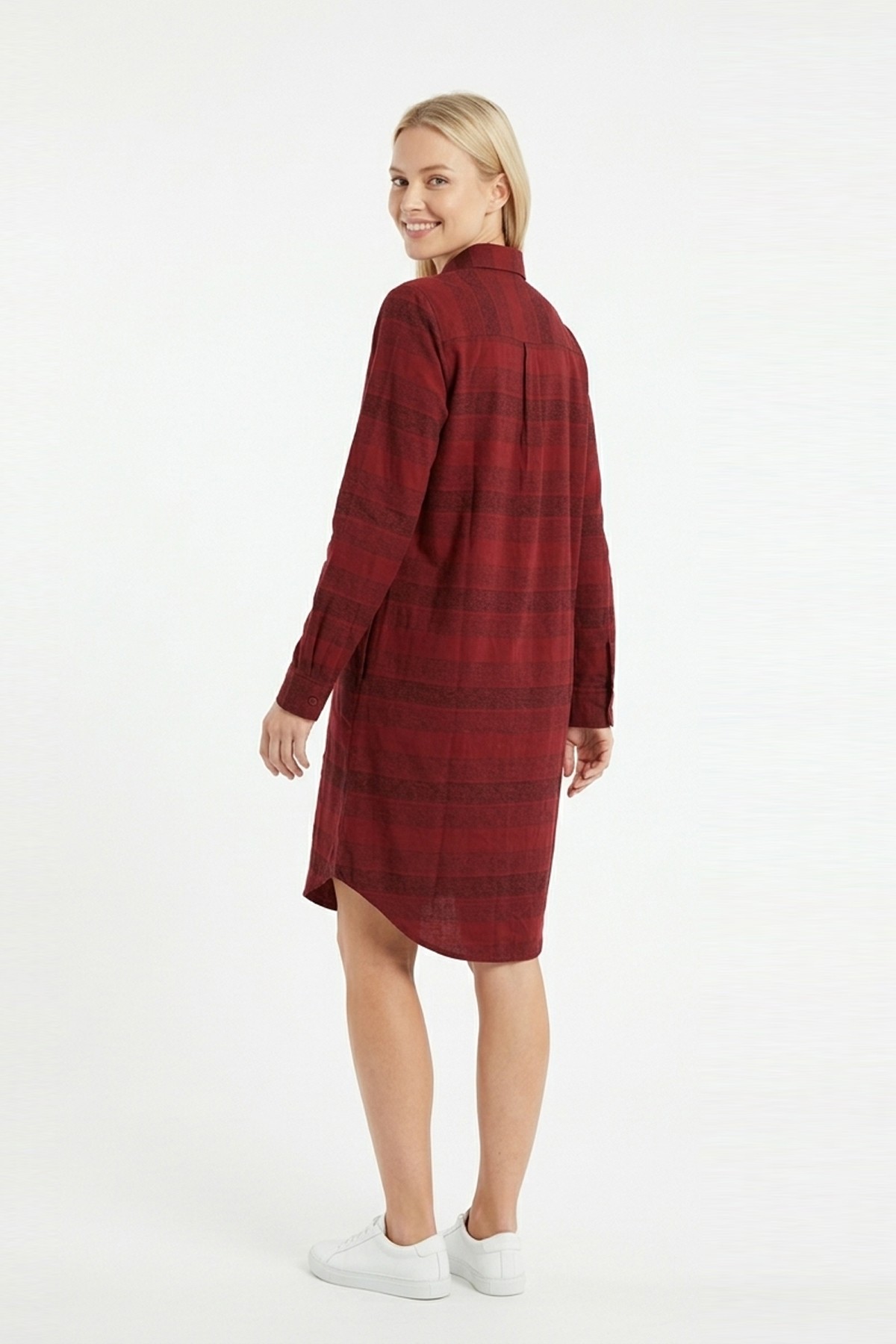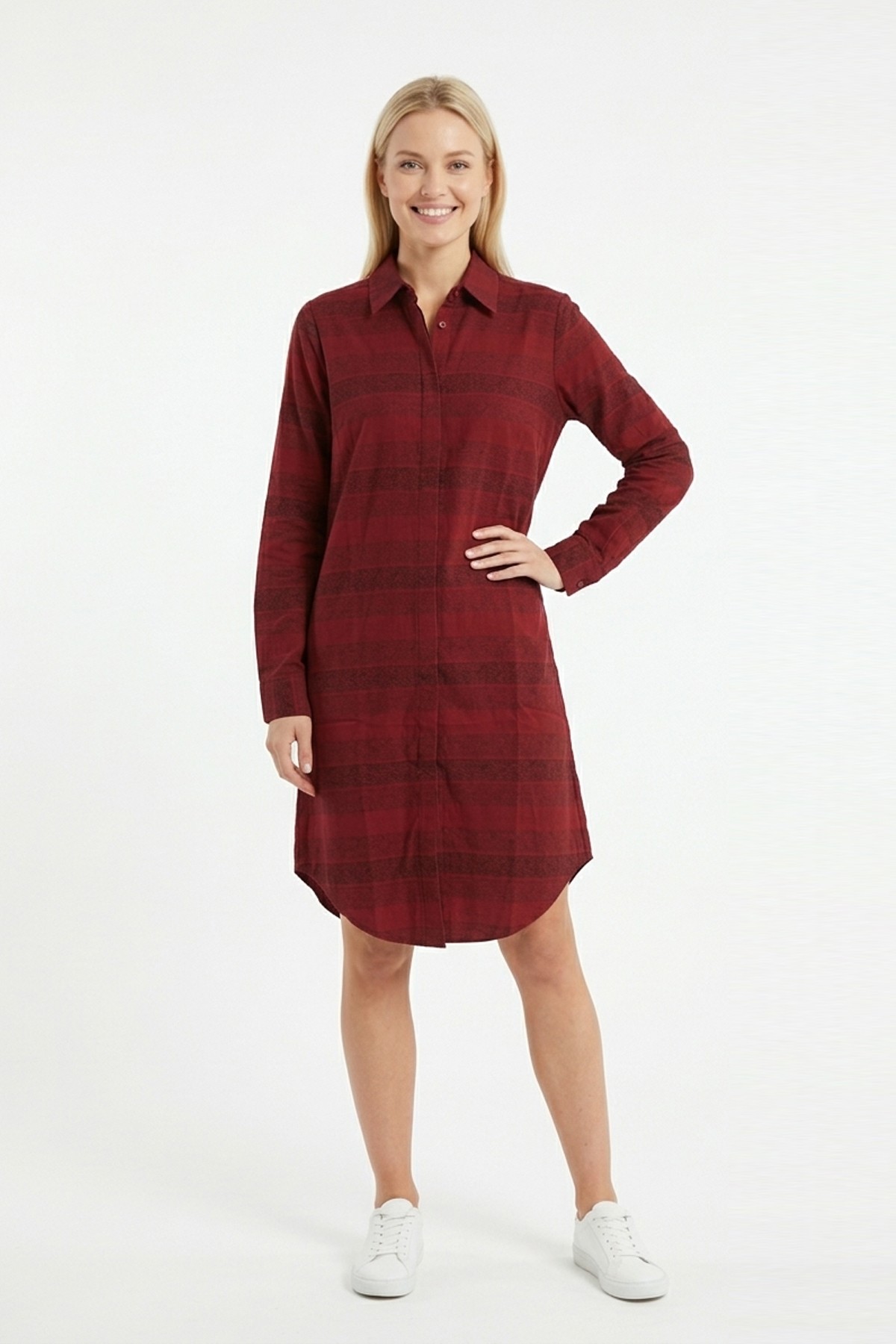 • Kadın bordo yatay çizgili gömlek tunik elbise, modern ve şık tasarımıyla günlük kombinlere zarif bir stil kazandırır;