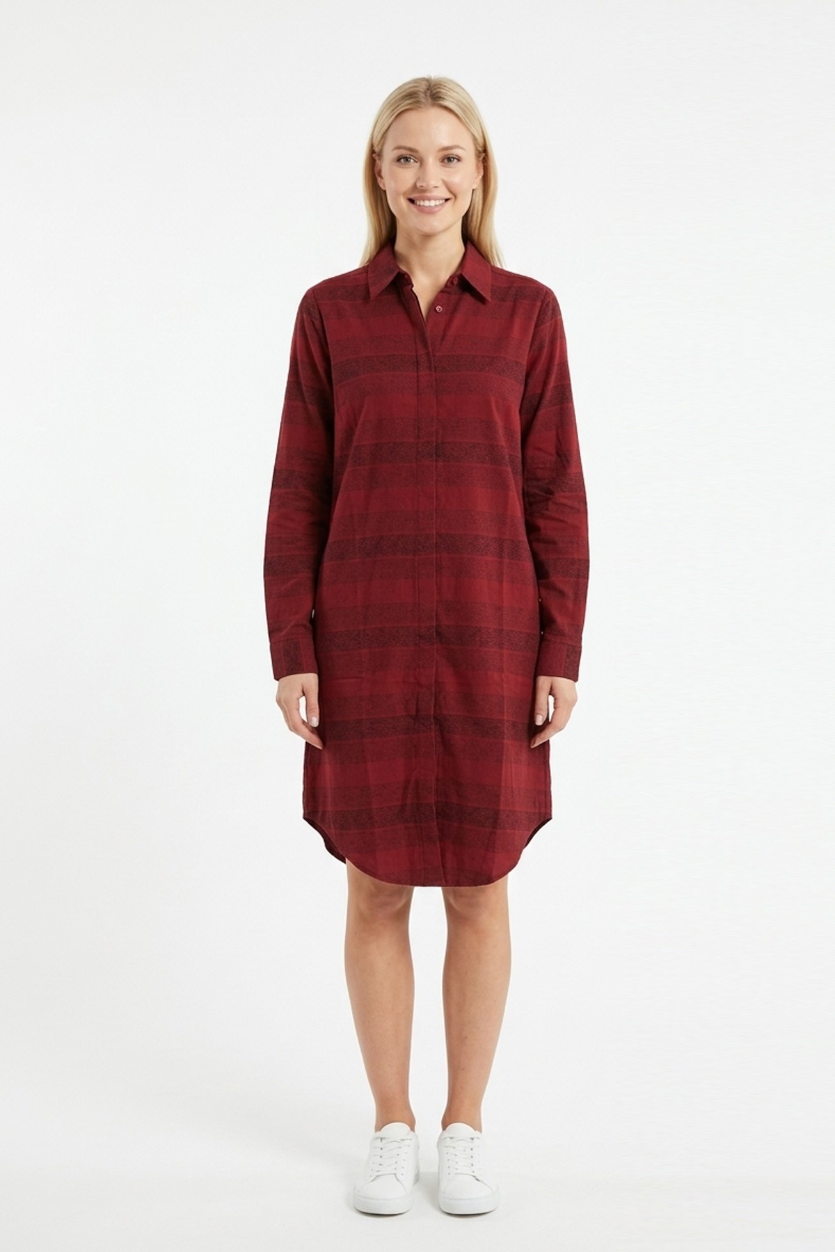 Kadın Bordo Yatay Çizgili Boydan Düğmeli Uzun Kollu Gömlek Tunik Elbise
