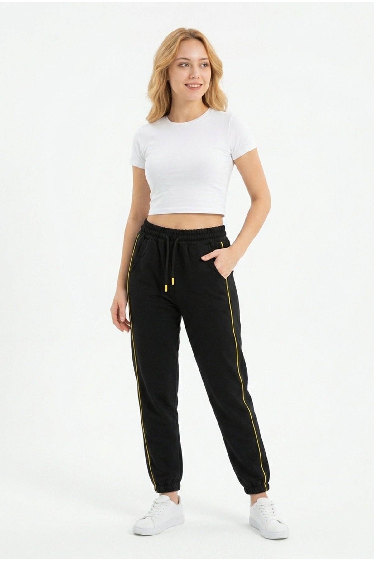 Kadın İki İplik Yanı İnce Çizgili Rahat Kesim Lastik Paçalı Cepli Günlük Spor Giyim Alt Eşofman