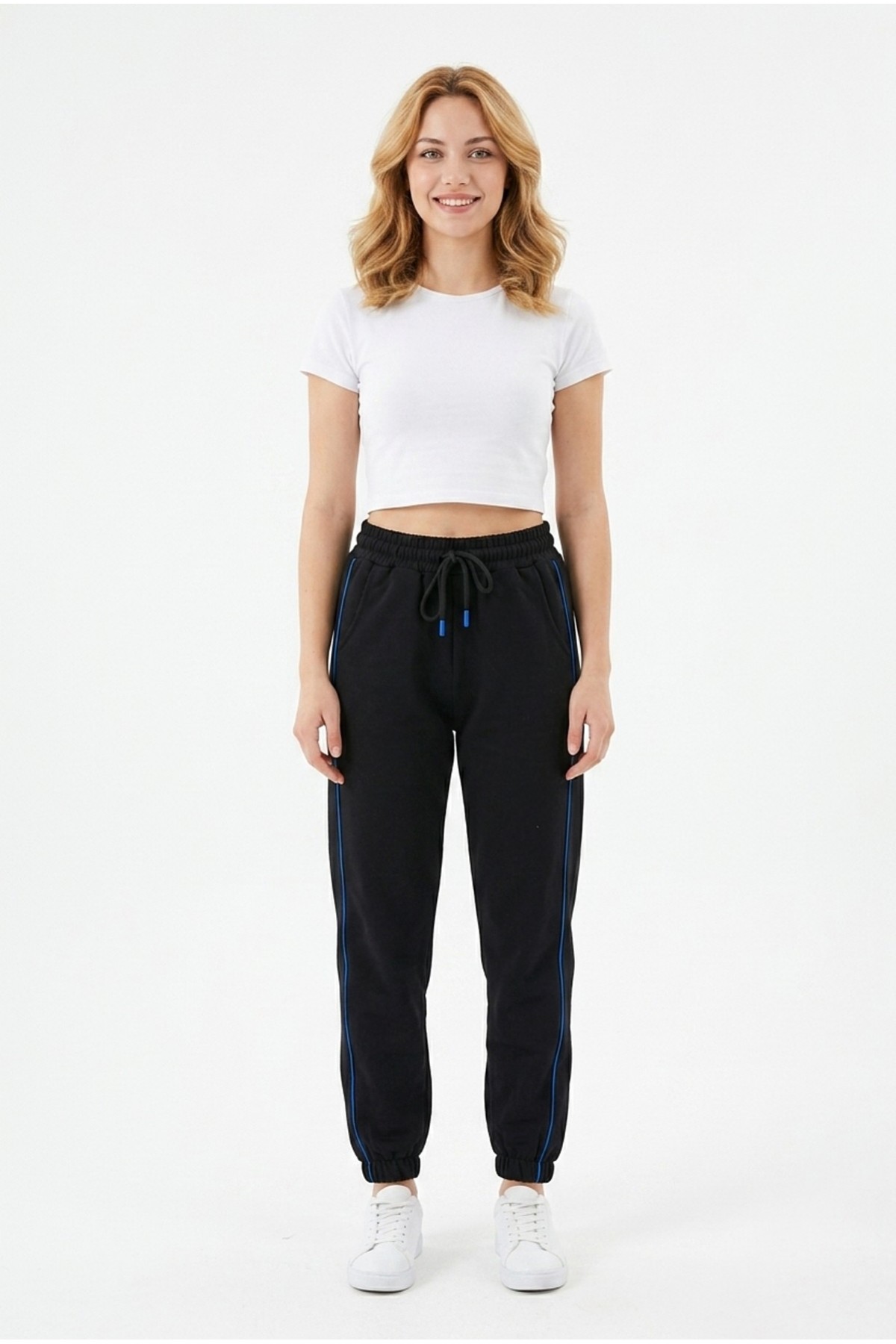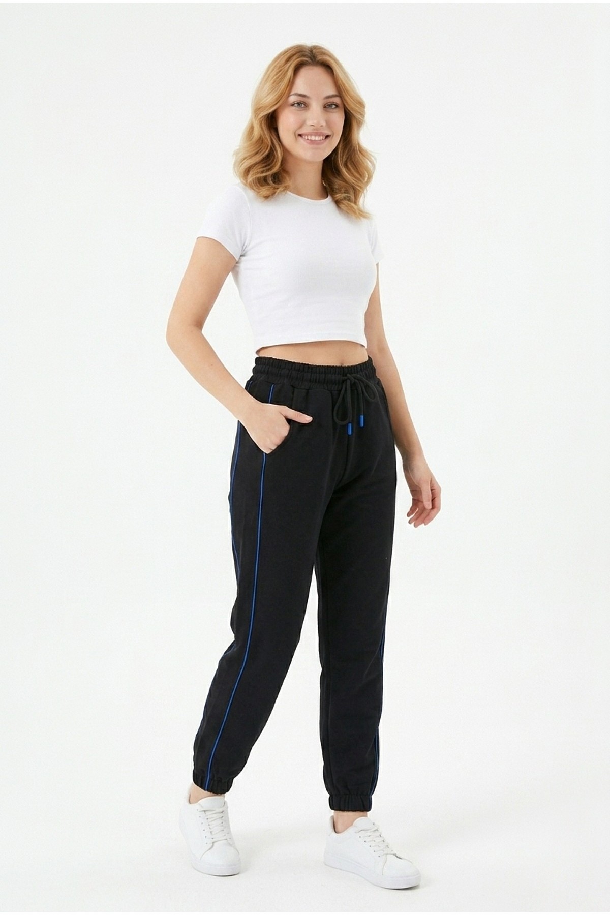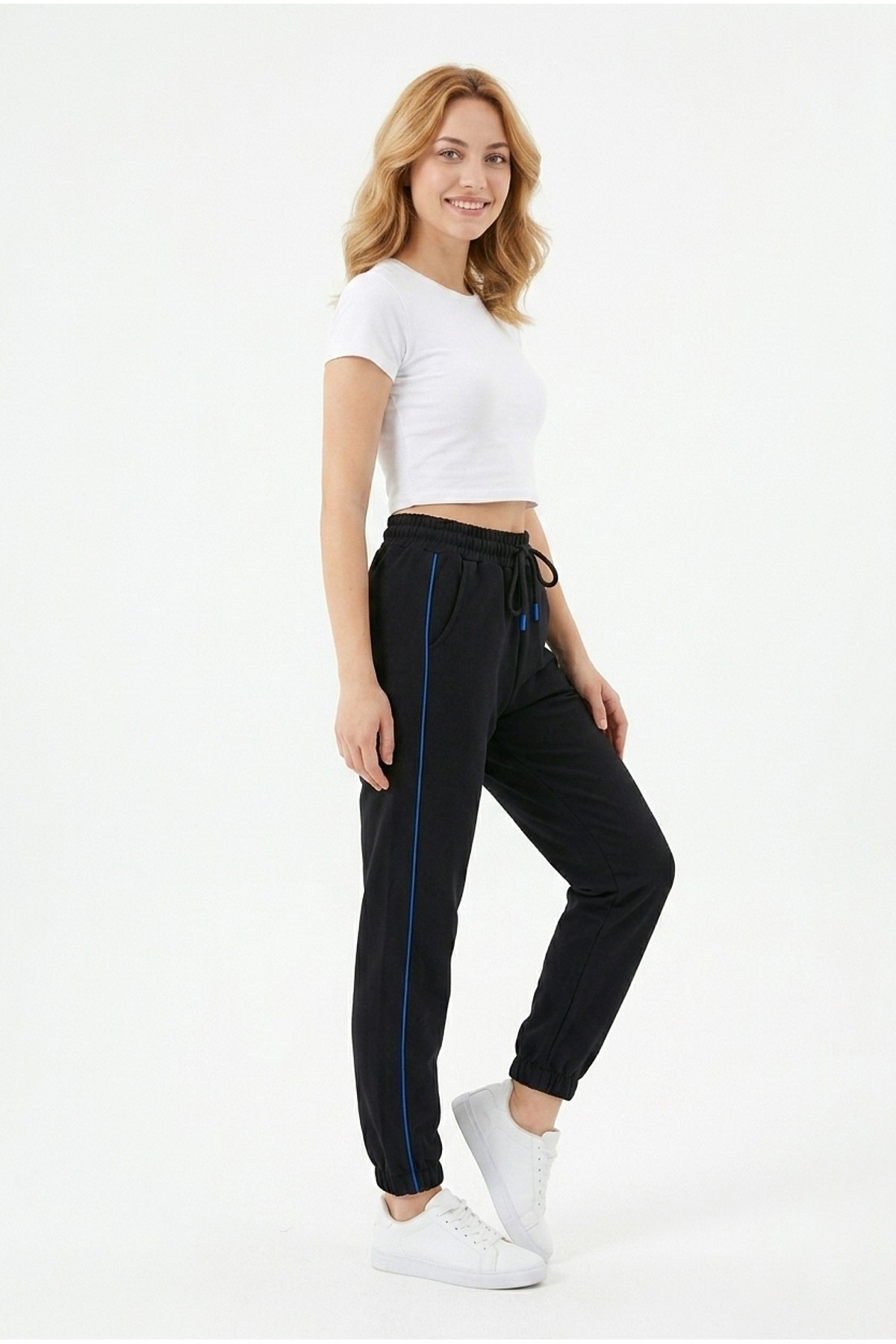Kadın İki İplik Yanı İnce Çizgili Rahat Kesim Lastik Paçalı Cepli Günlük Spor Giyim Alt Eşofman