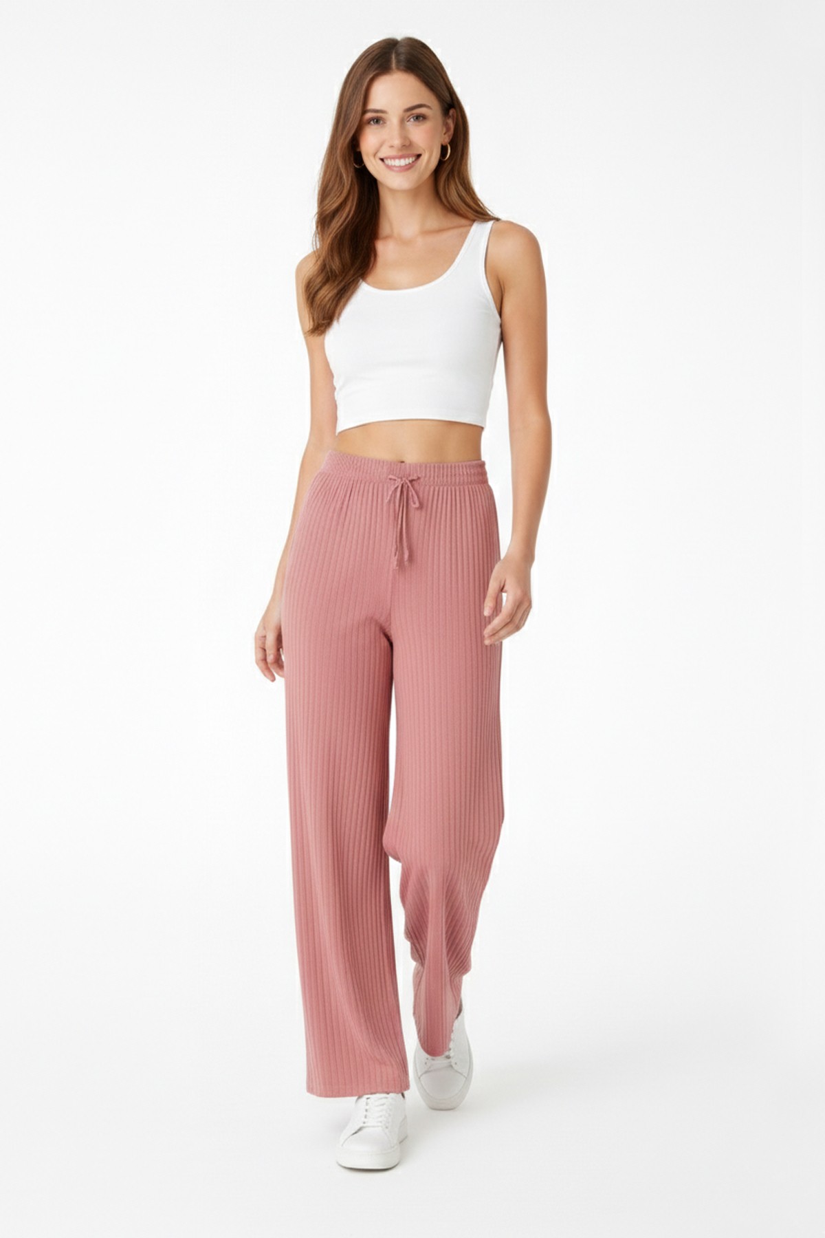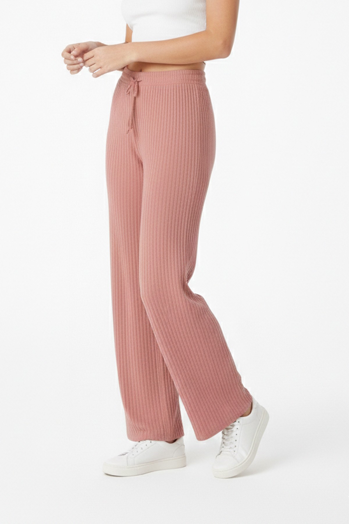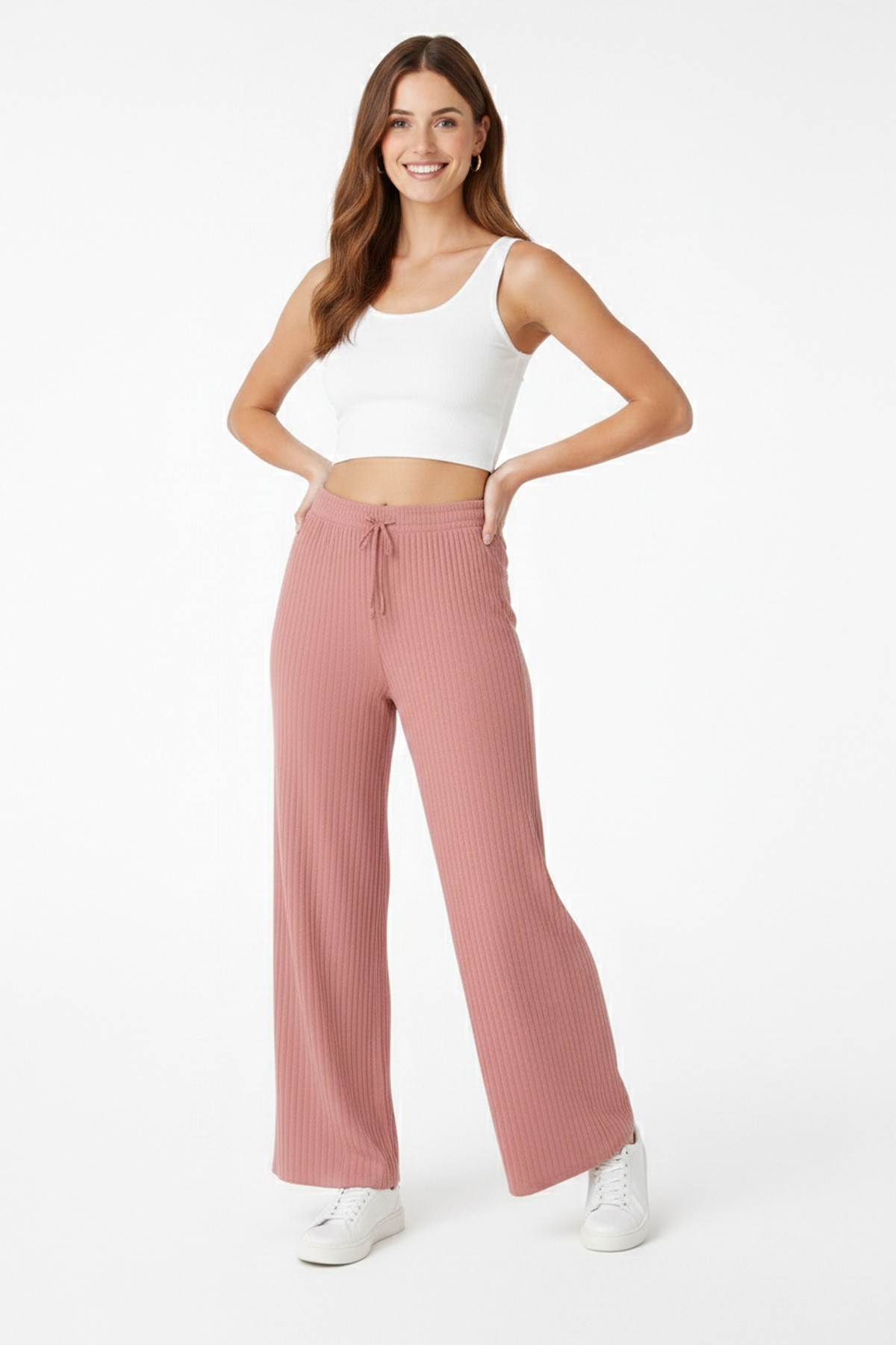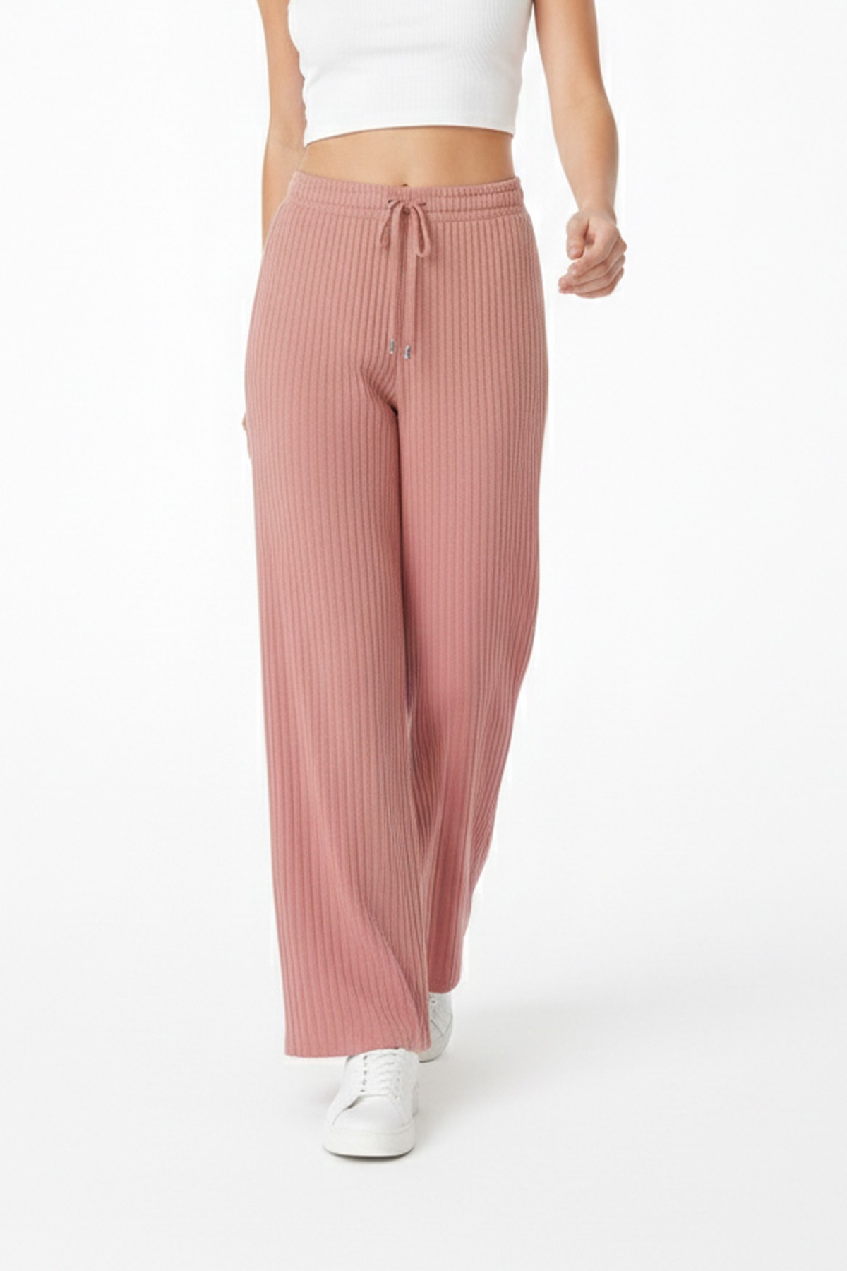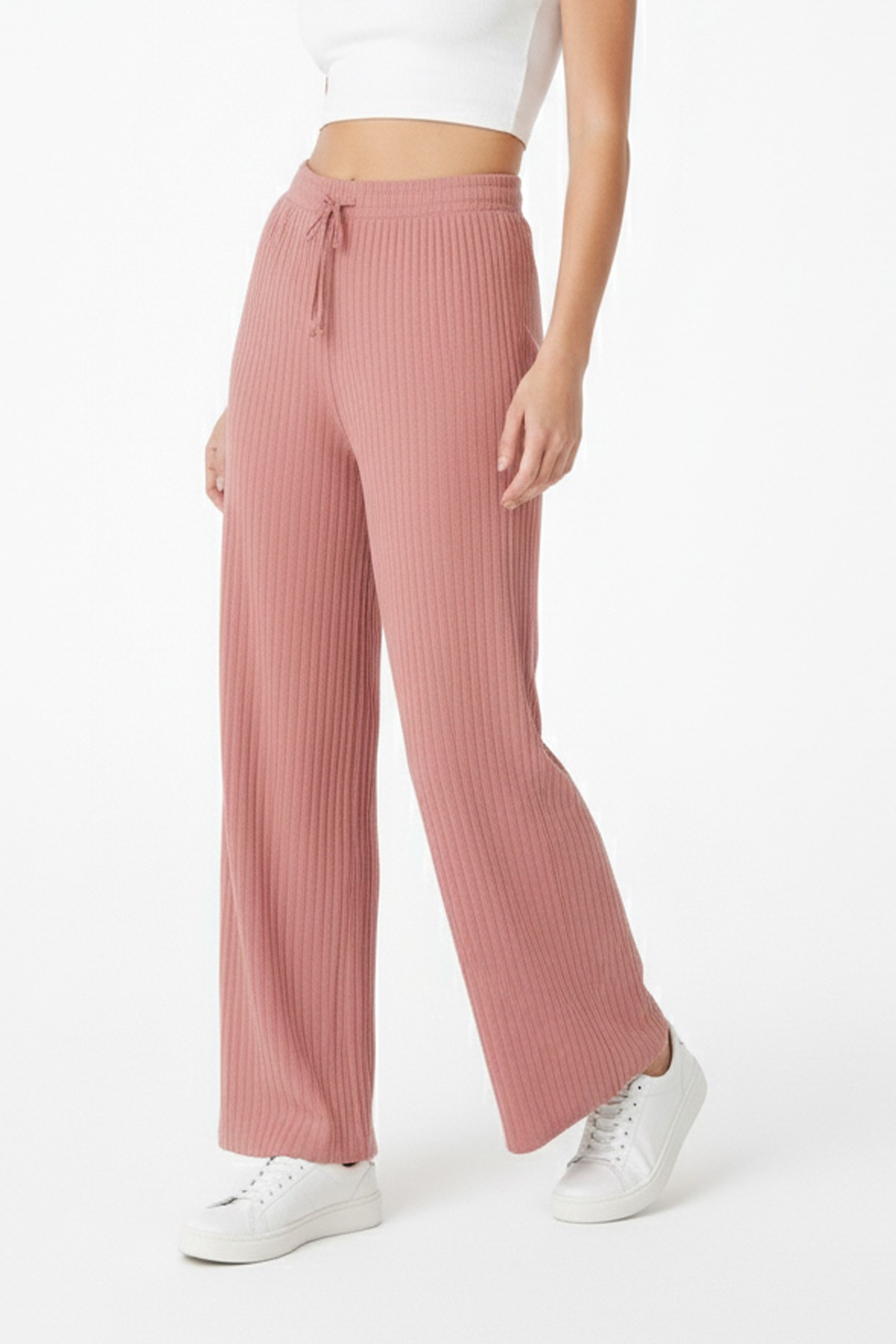 Kadın Pembe Yüksek Bel Fitilli Örme Bağcıklı Esnek Likralı Geniş Paça Pantolon