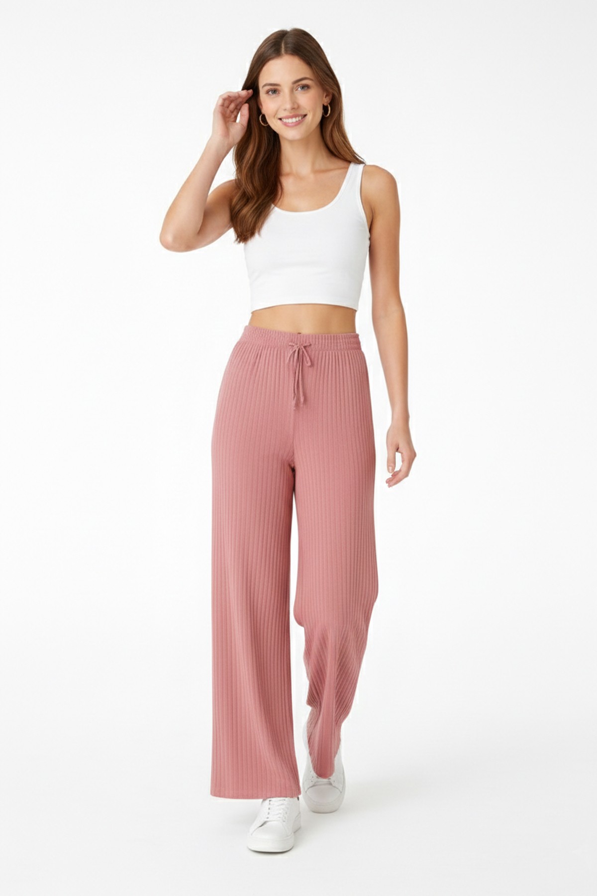 • Kadın Yüksek Bel Fitilli Örme Bağcıklı Esnek Likralı Geniş Paça Pantolon, modern ve rahat tasarımıyla günlük kombinlerin tamamlayıcı parçasıdır.;