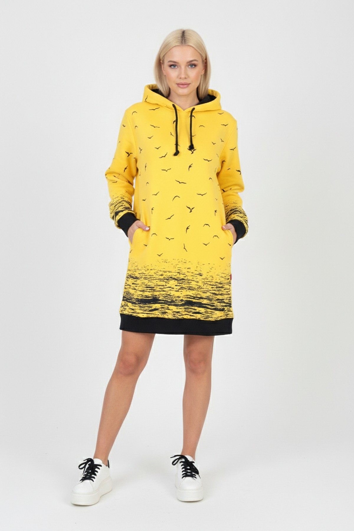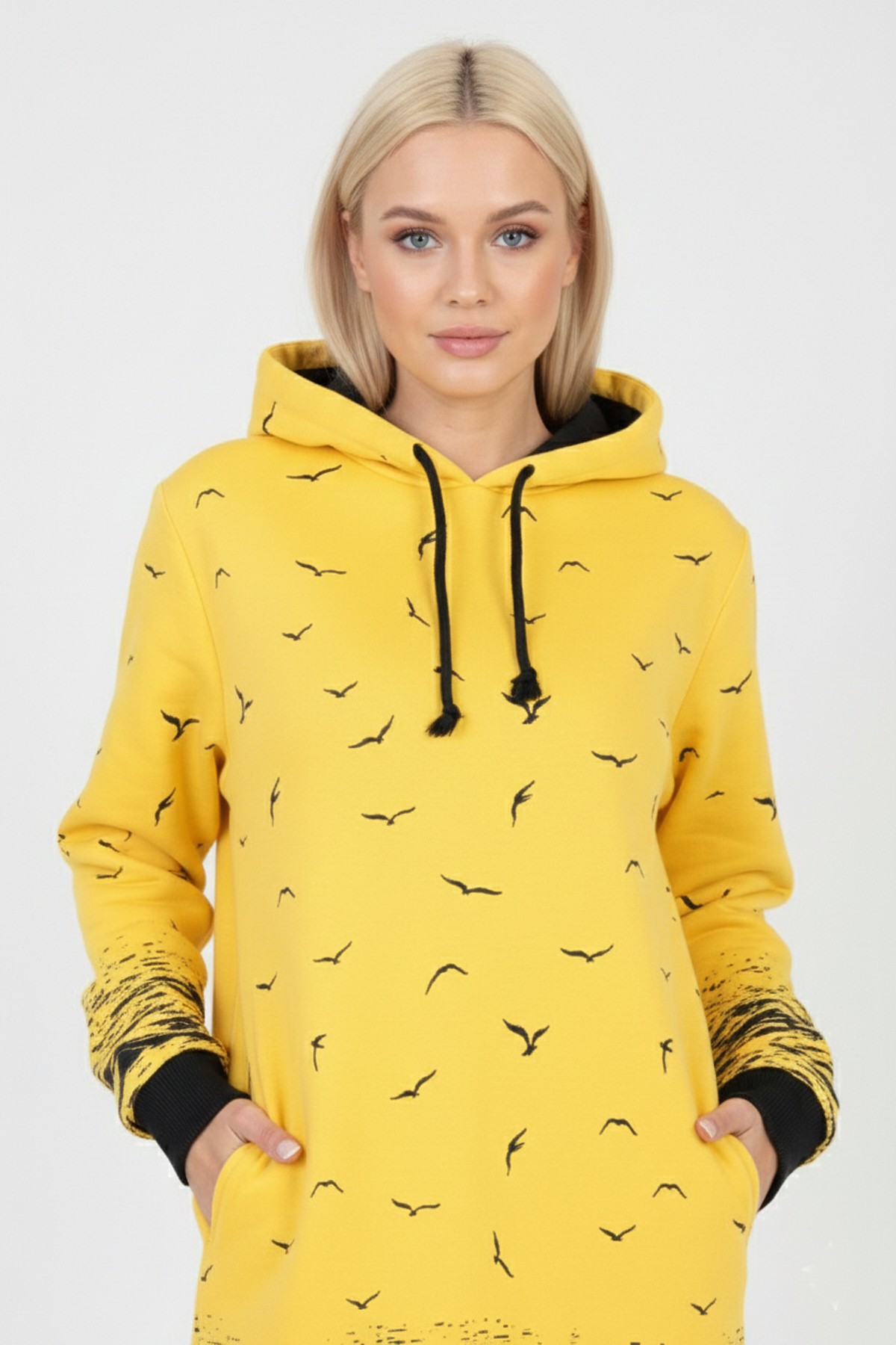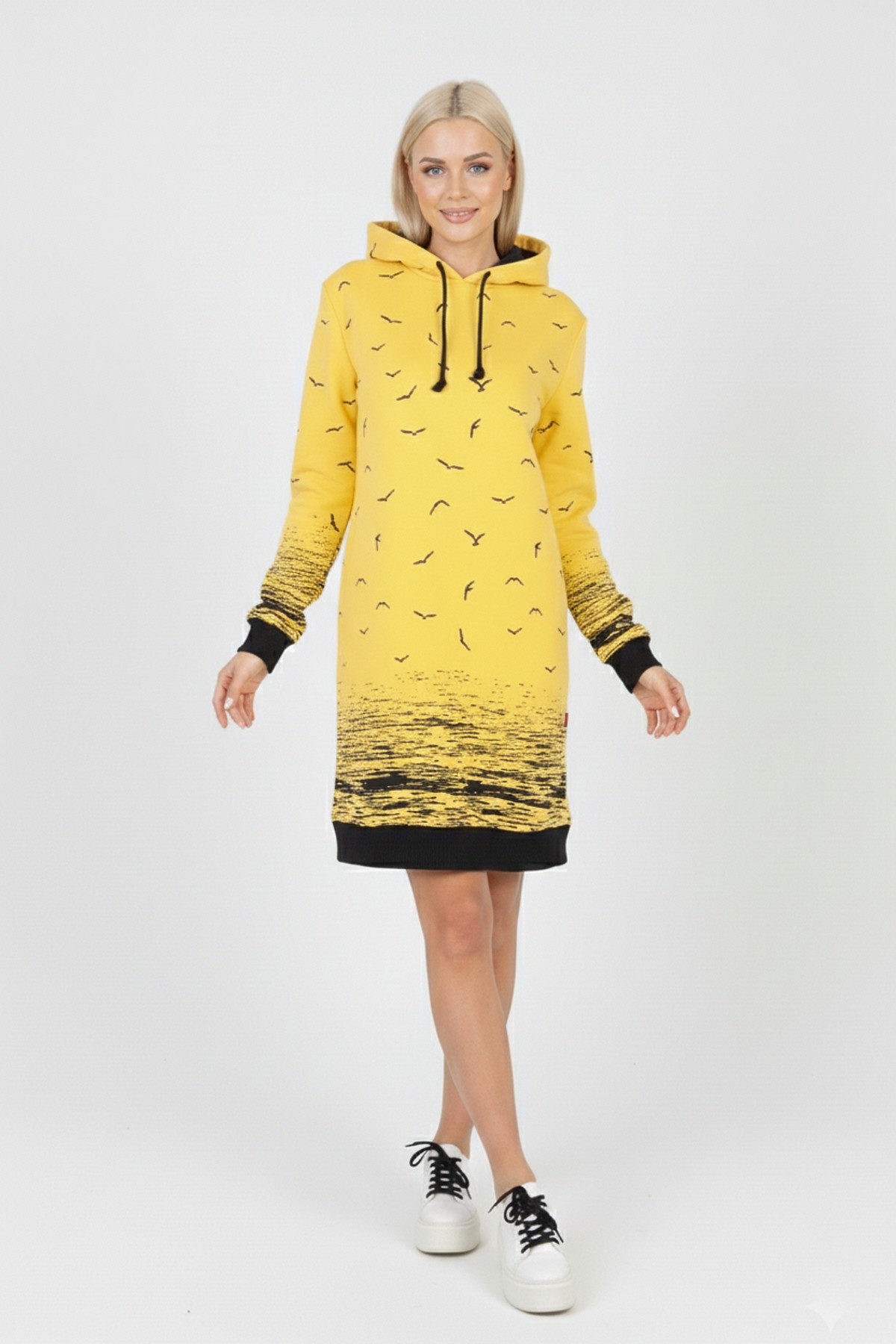 Kadın Sarı Martı Desenli Kapüşonlu Cepli Uzun Kollu Jakarlı İnterlok Penye Sweatshirt Elbise