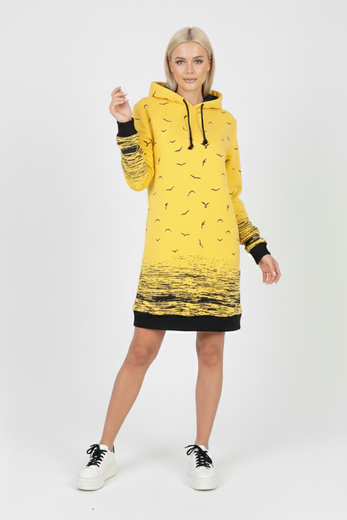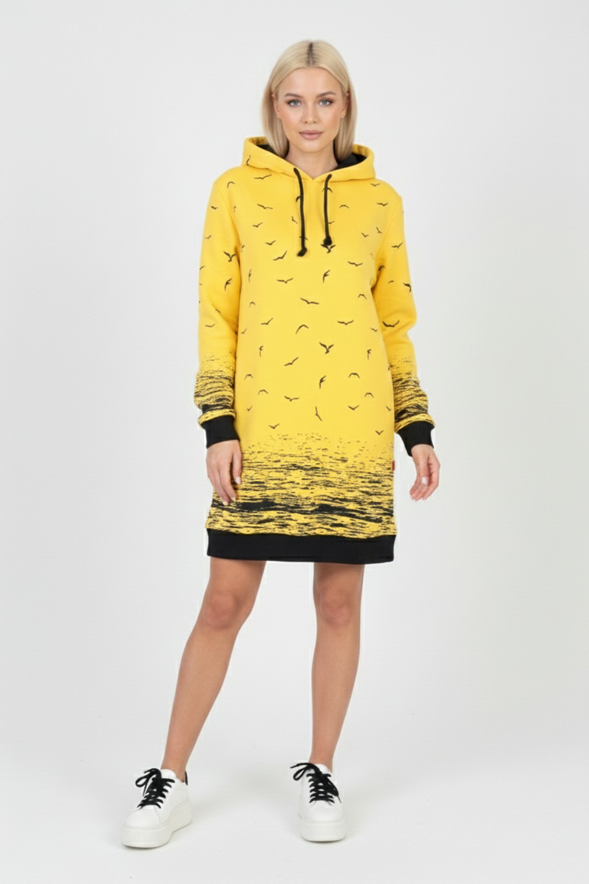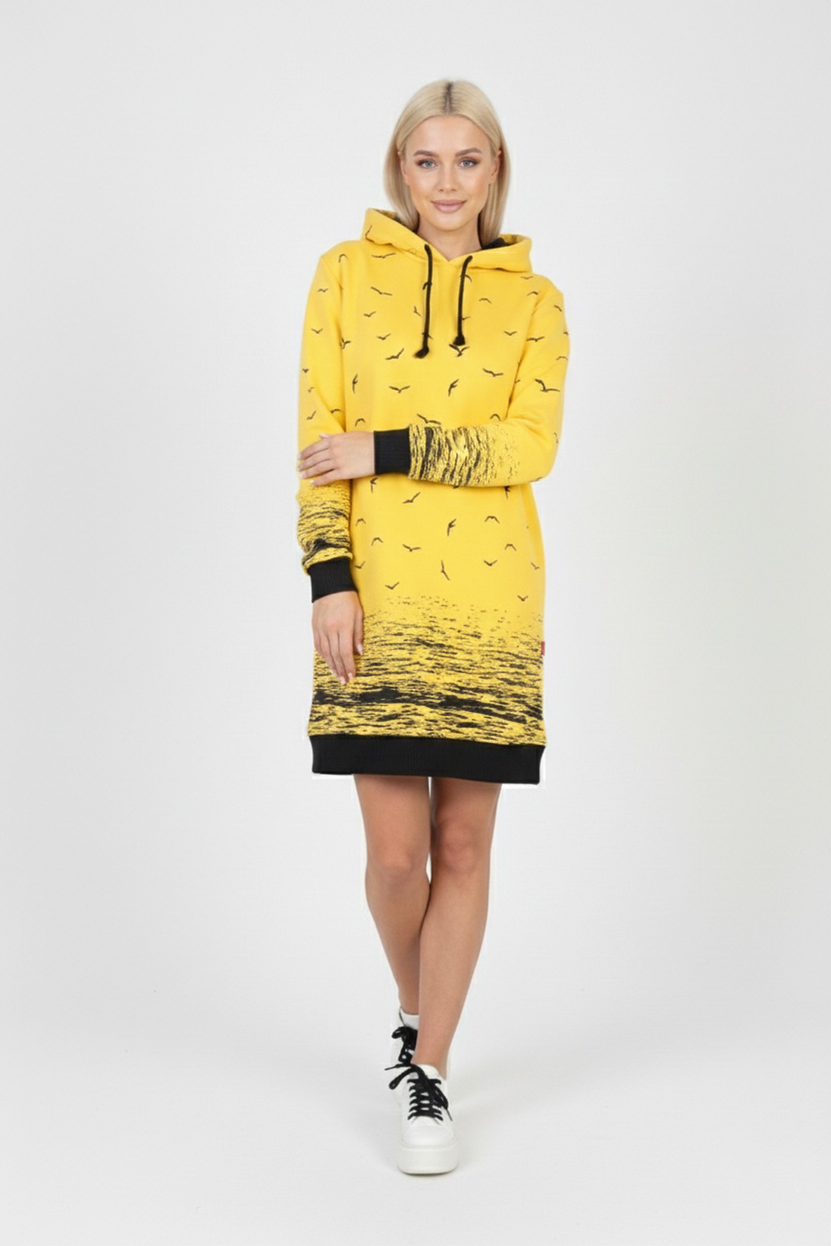 Kadın Sarı Martı Desenli Kapüşonlu Cepli Uzun Kollu Jakarlı İnterlok Penye Sweatshirt Elbise