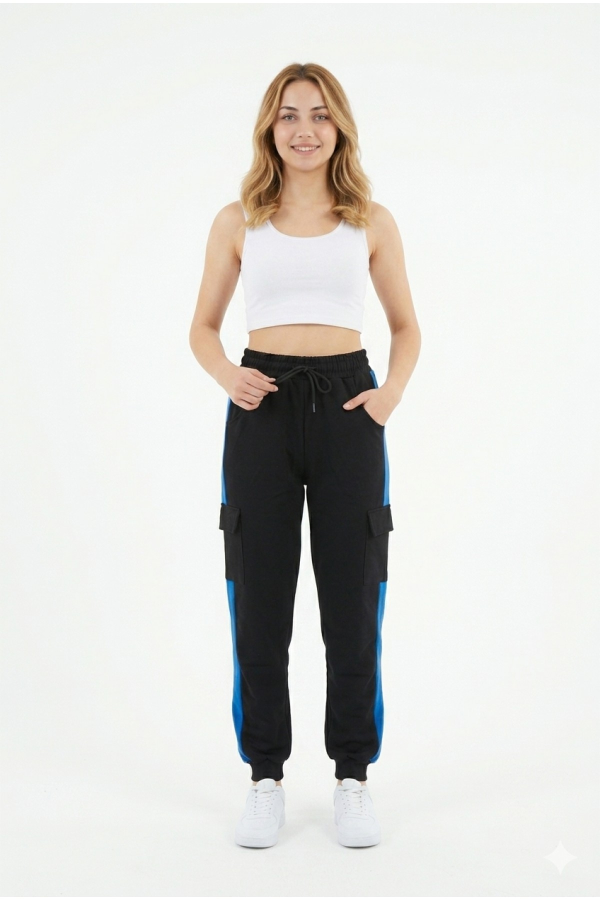· Kadın şeritli kargo cepli rahat kesim eşofman altı, günlük kullanım ve spor kombinler için modern ve fonksiyonel bir tasarım sunar;