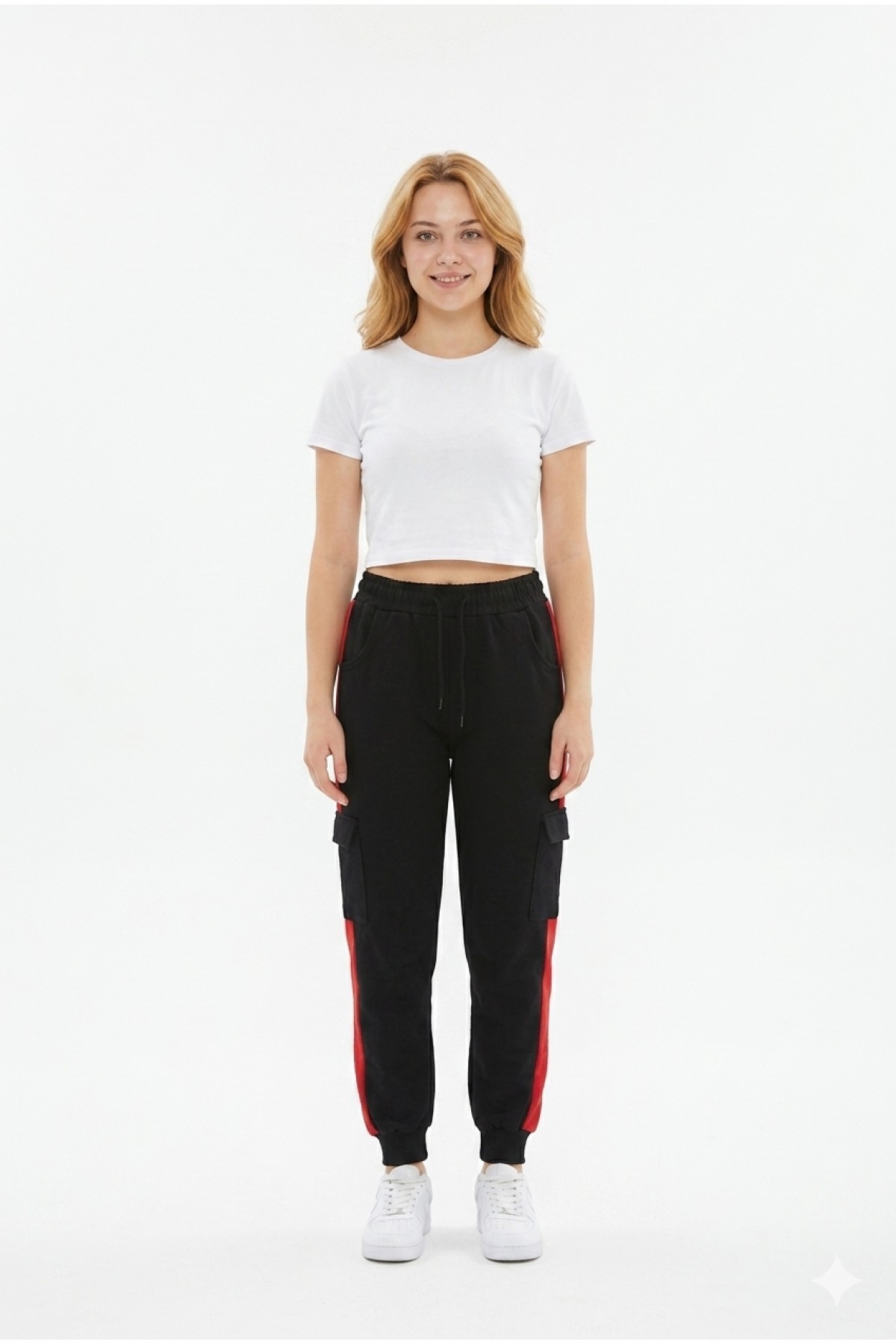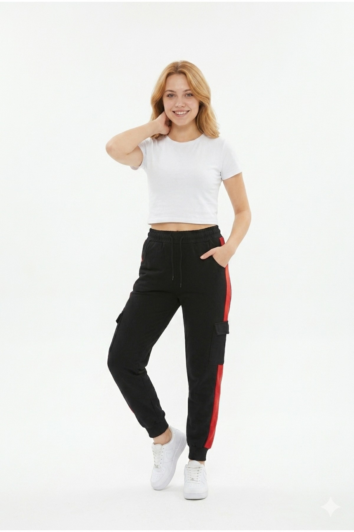 · Kadın şeritli kargo cepli rahat kesim eşofman altı, günlük kullanım ve spor kombinler için modern ve fonksiyonel bir tasarım sunar;