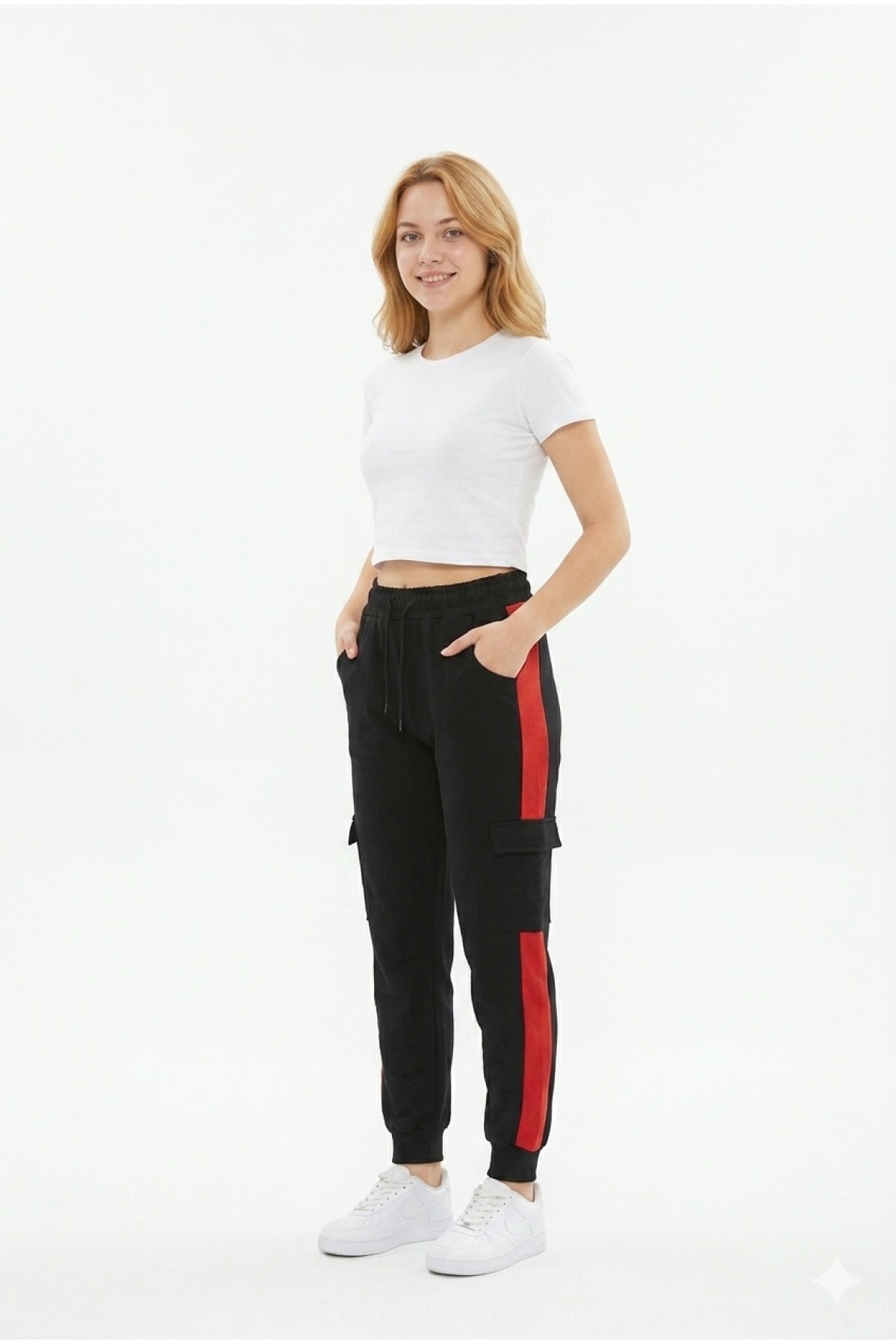 Kadın Şeritli Kargo Cepli Rahat Kesim Lastik Paçalı Günlük Spor Alt Eşofman