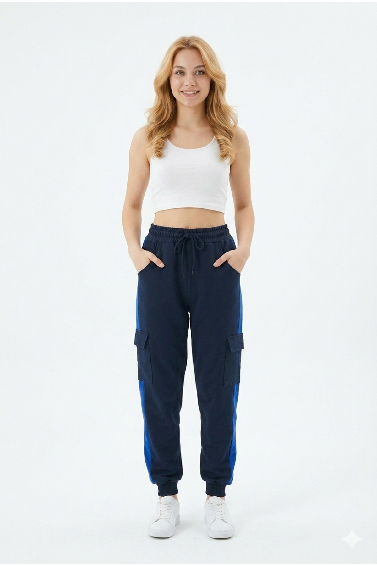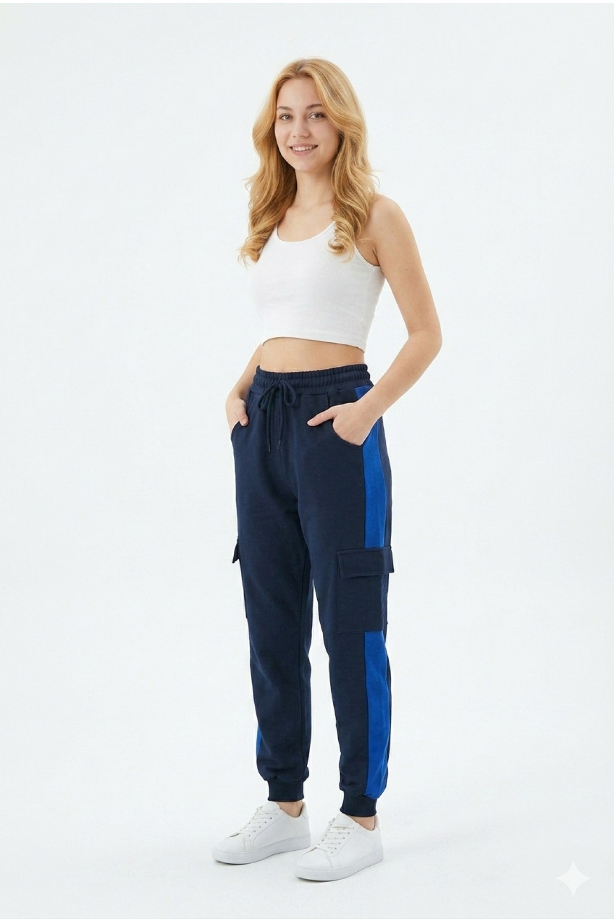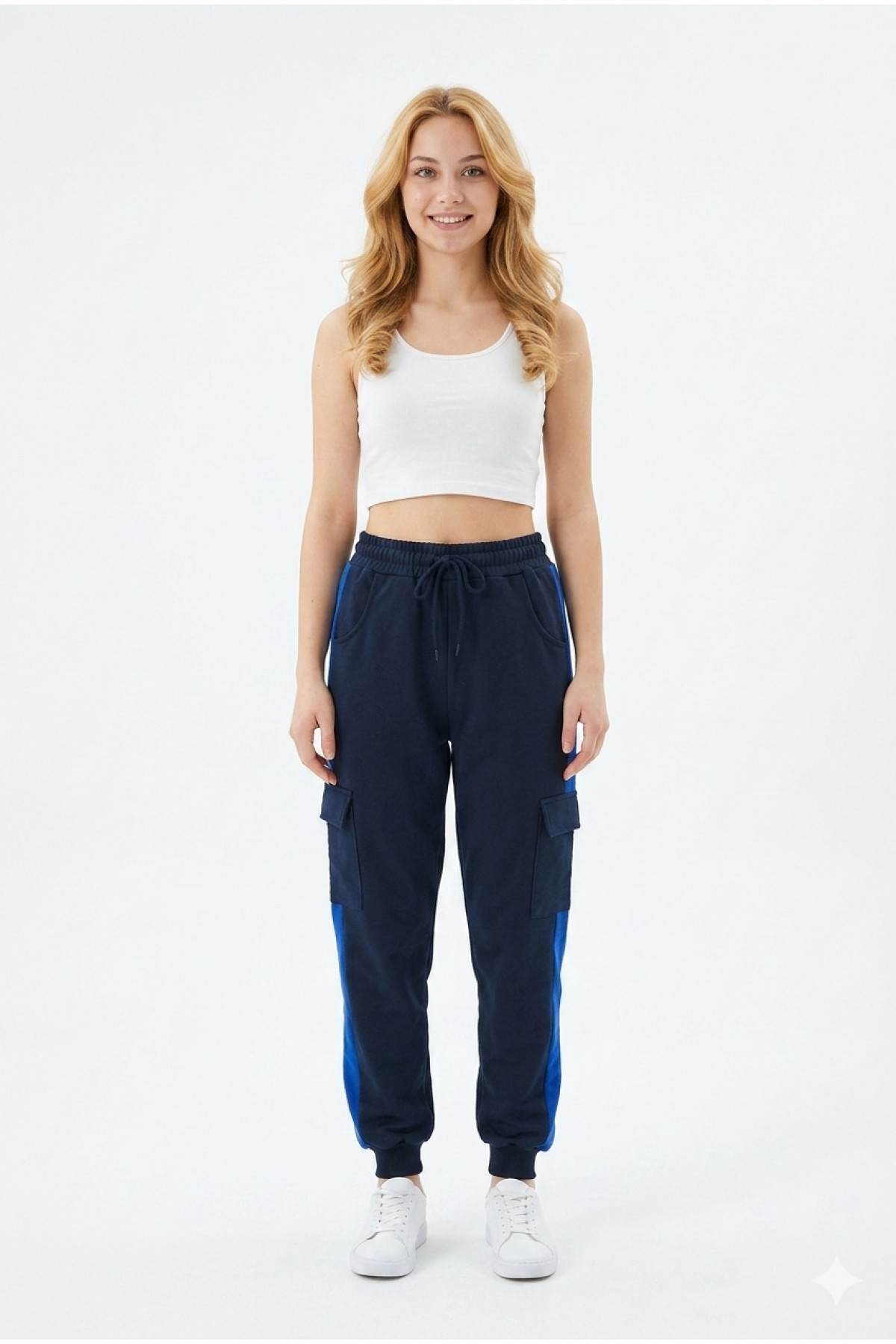 · Kadın şeritli kargo cepli rahat kesim eşofman altı, günlük kullanım ve spor kombinler için modern ve fonksiyonel bir tasarım sunar;