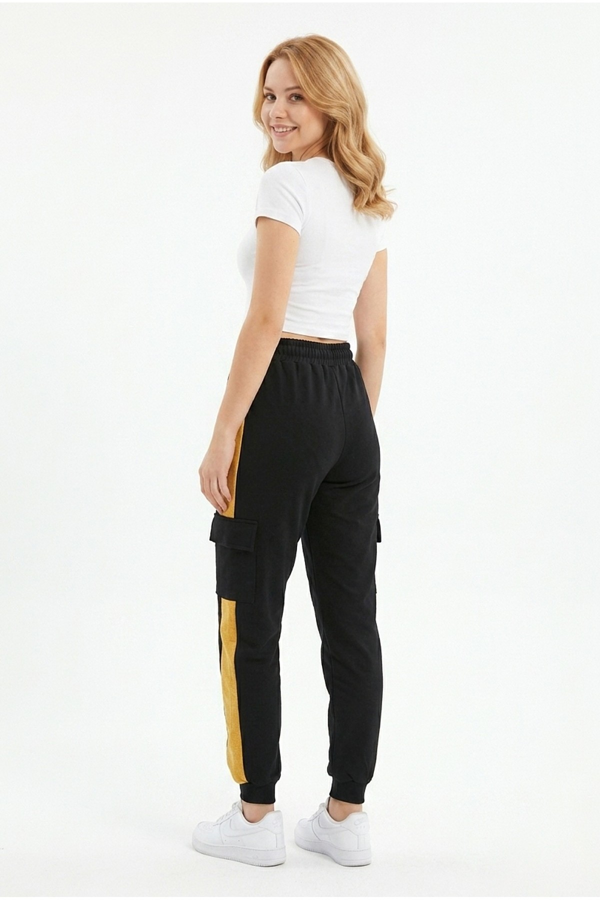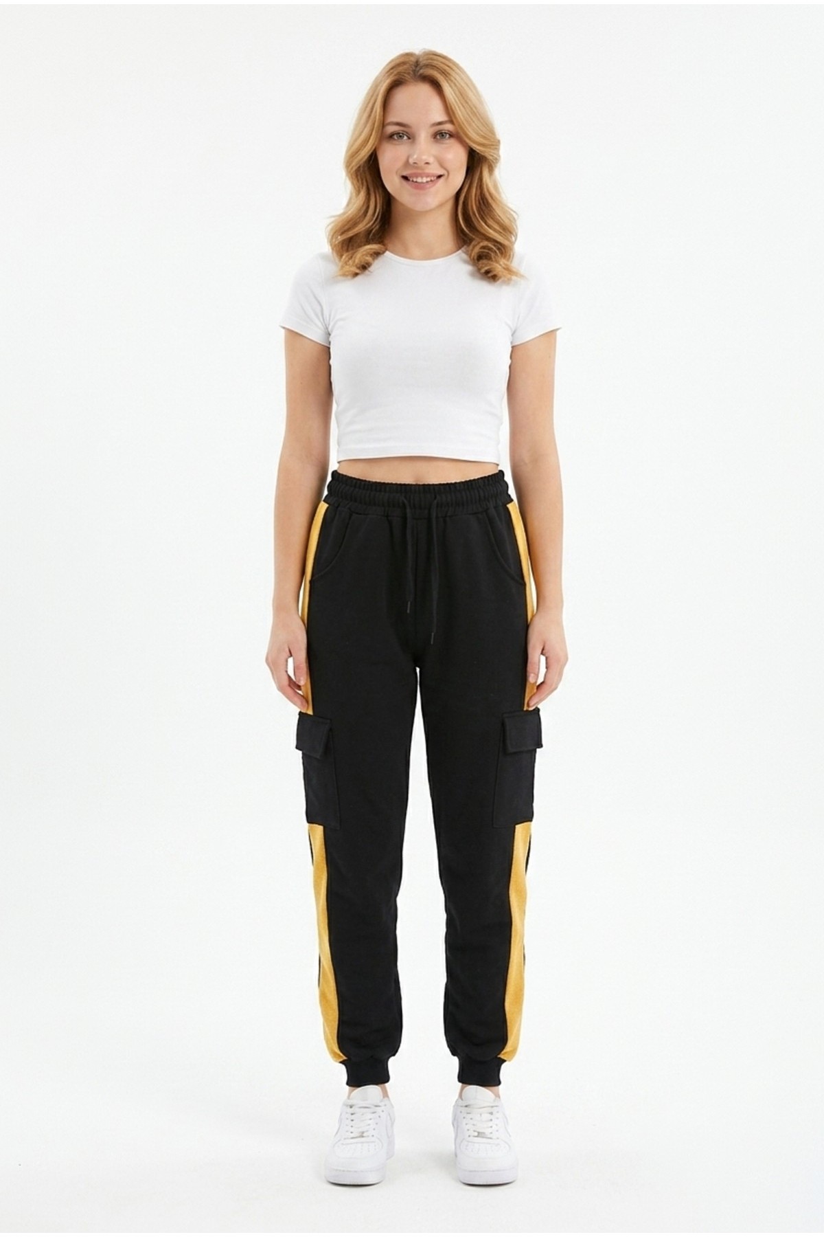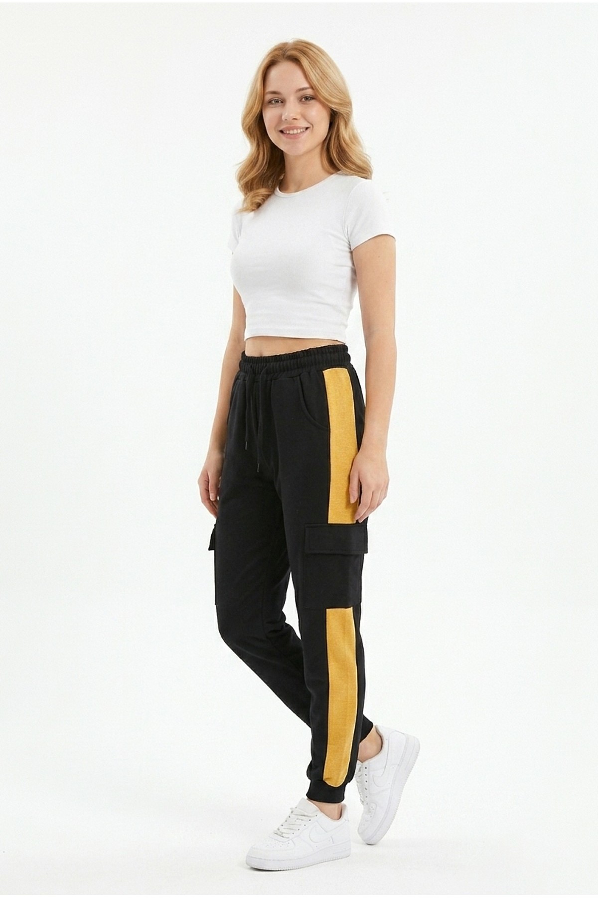 · Kadın şeritli kargo cepli rahat kesim eşofman altı, günlük kullanım ve spor kombinler için modern ve fonksiyonel bir tasarım sunar;