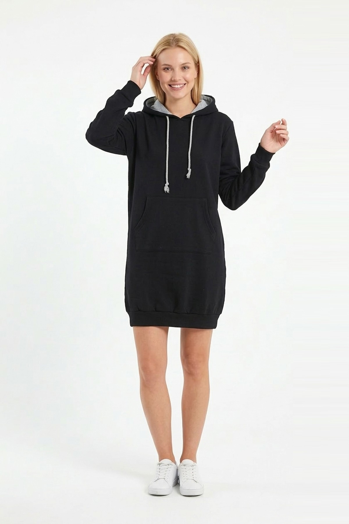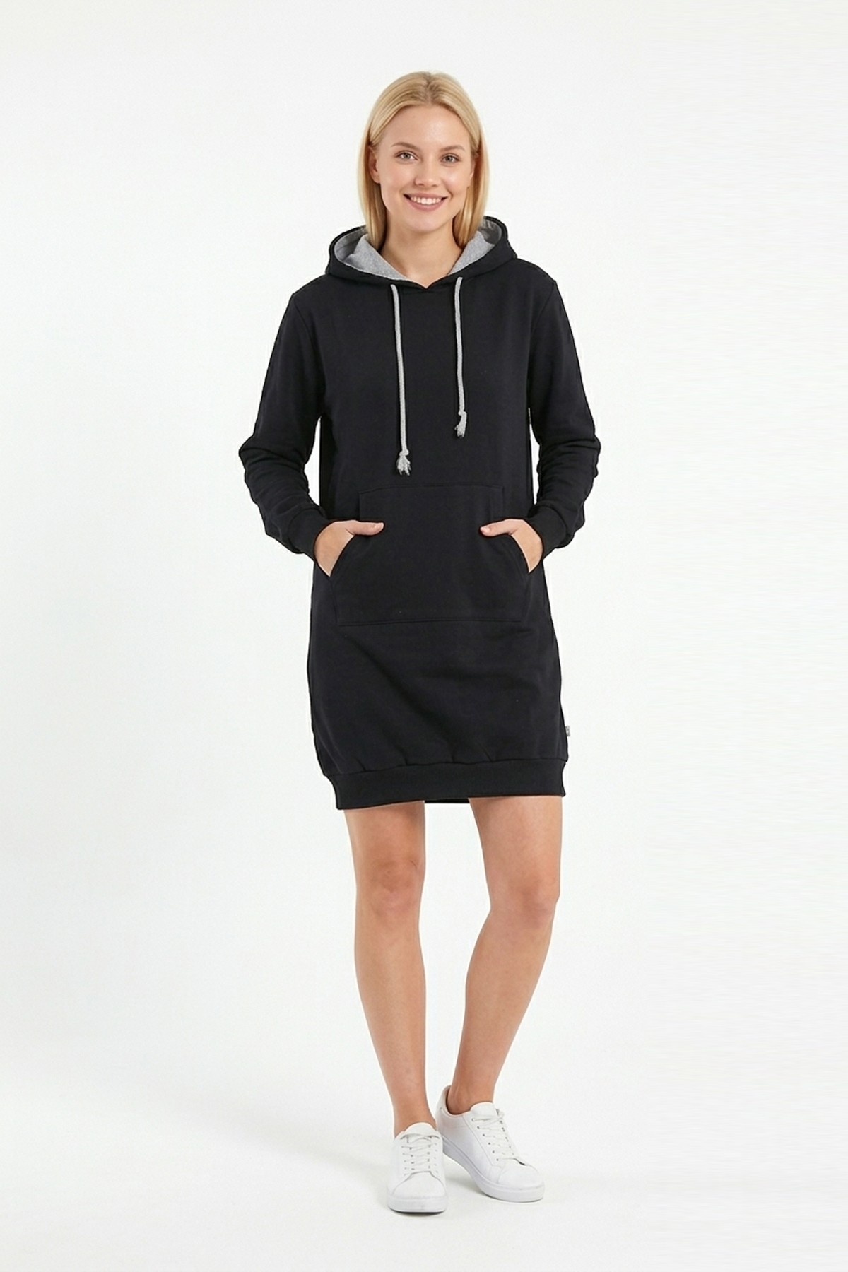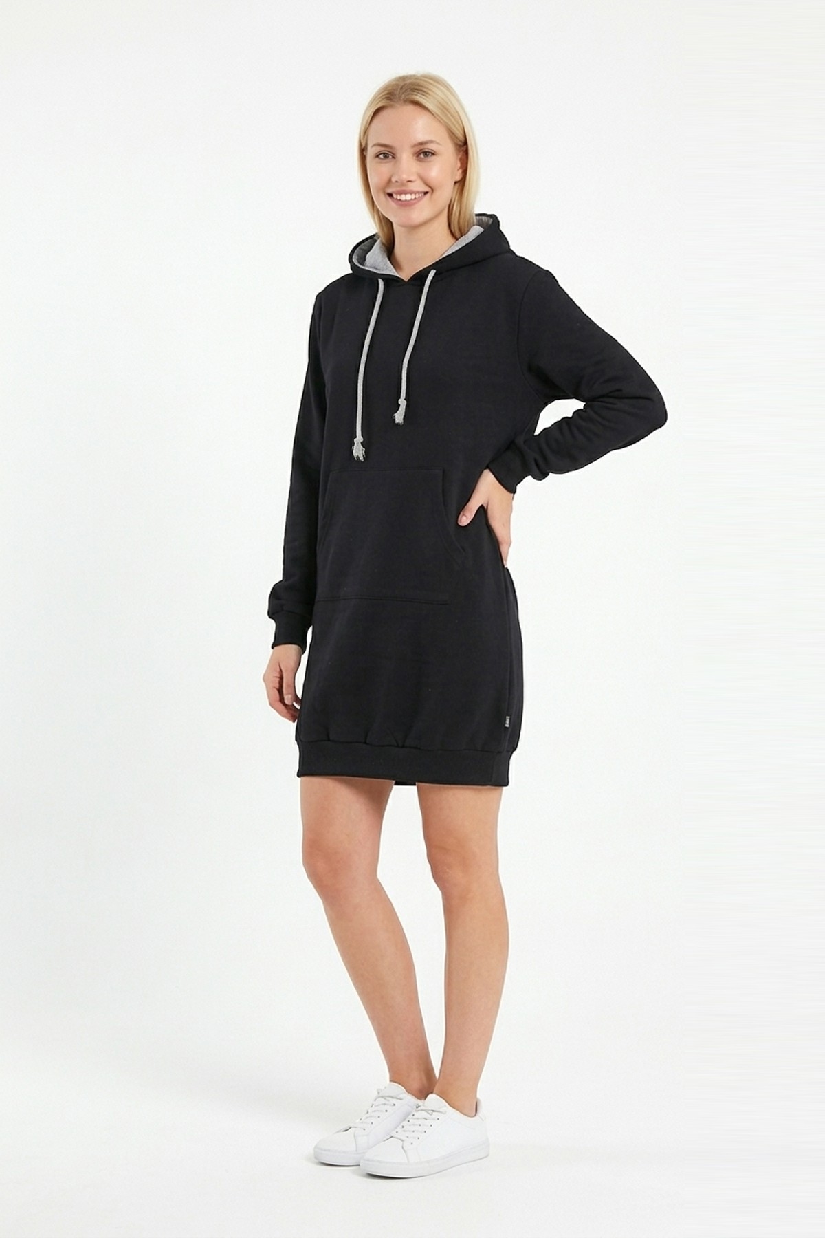 • Kadın siyah kapüşonlu sweatshirt tunik elbise, sade ve modern tasarımıyla günlük kombinlerde şık bir görünüm sunar;