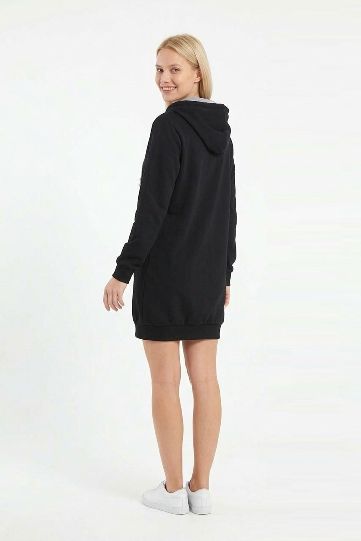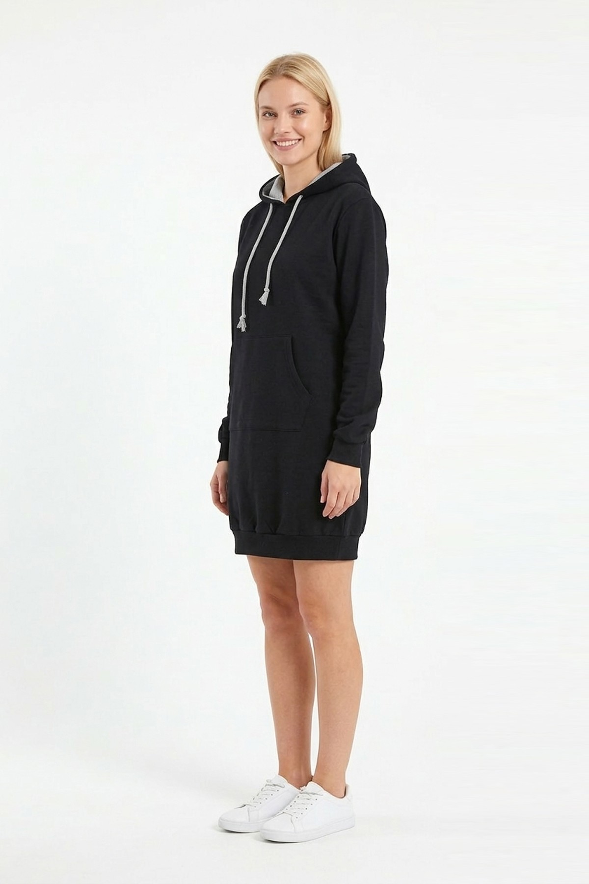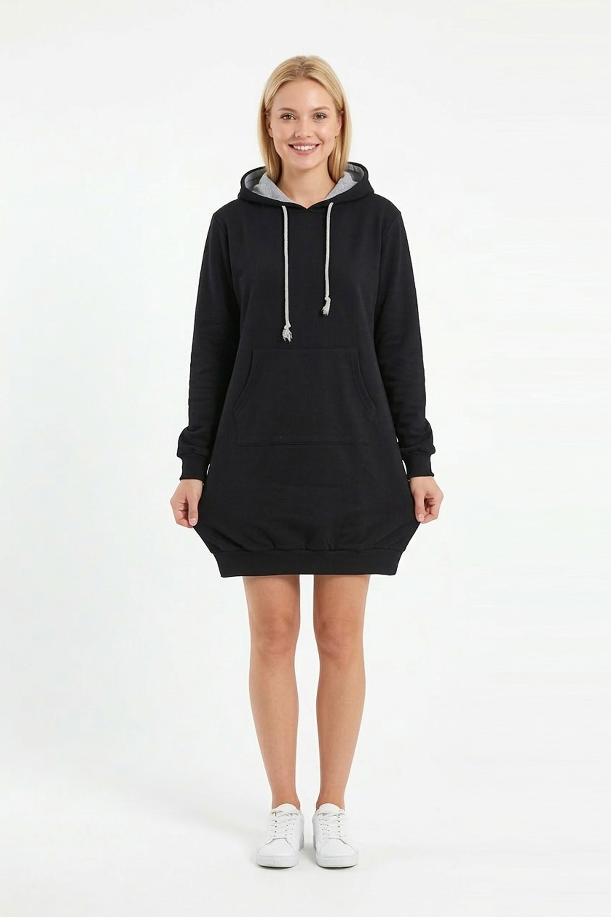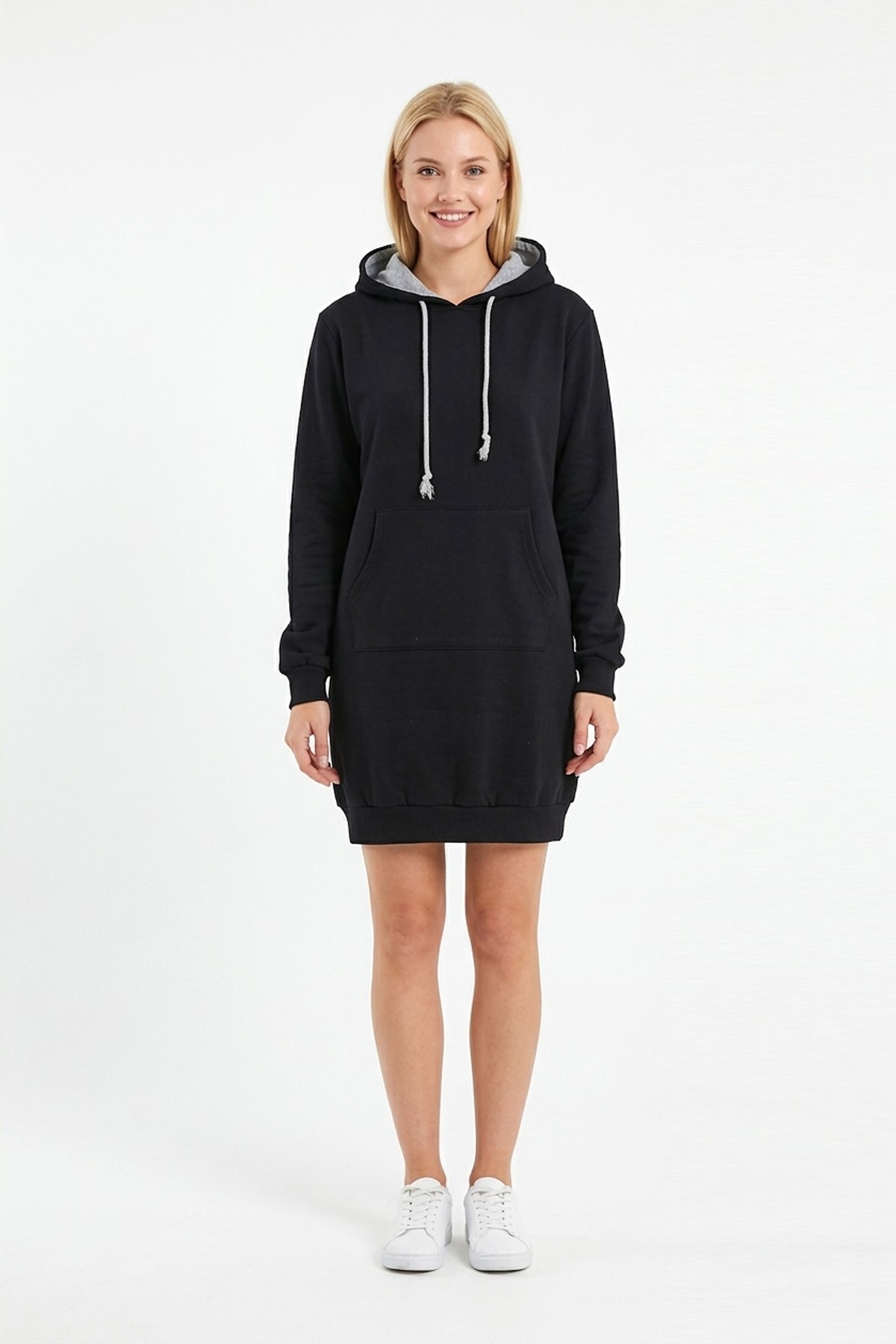 • Kadın siyah kapüşonlu sweatshirt tunik elbise, sade ve modern tasarımıyla günlük kombinlerde şık bir görünüm sunar;