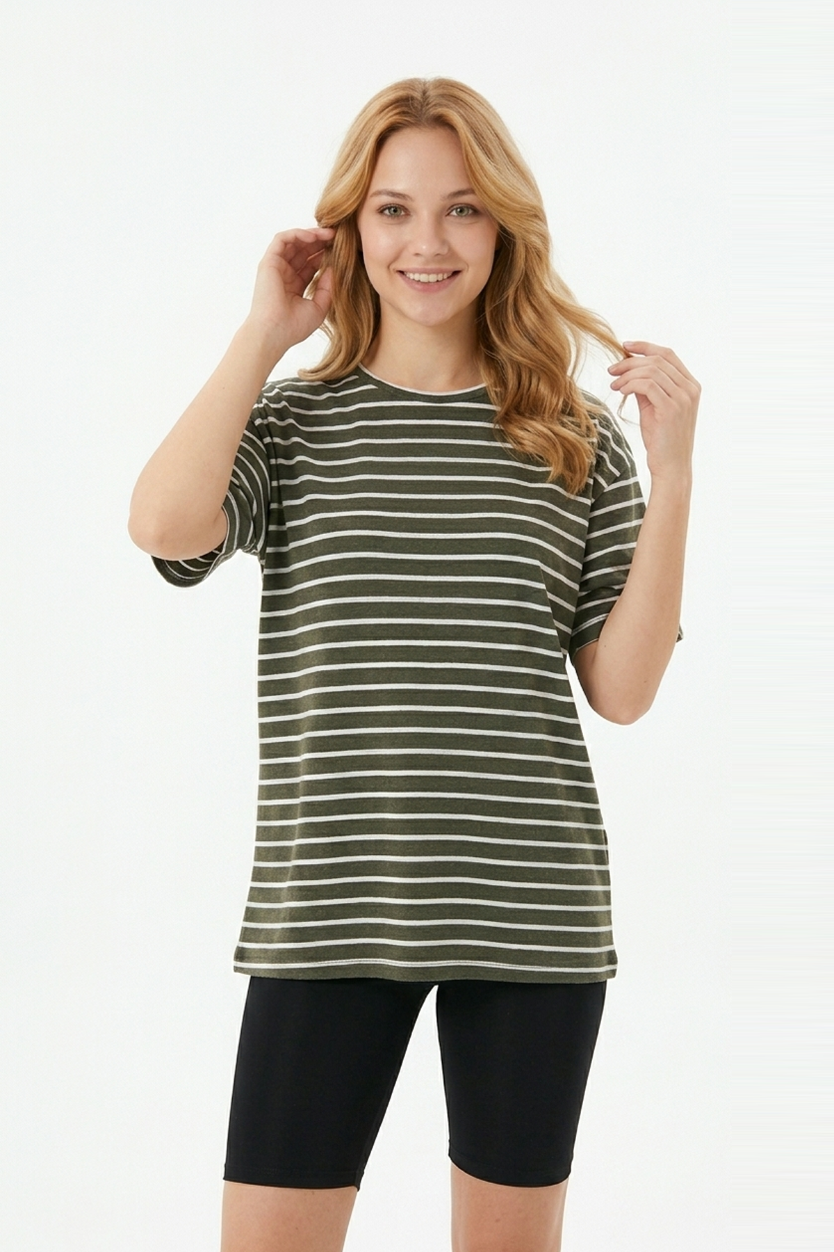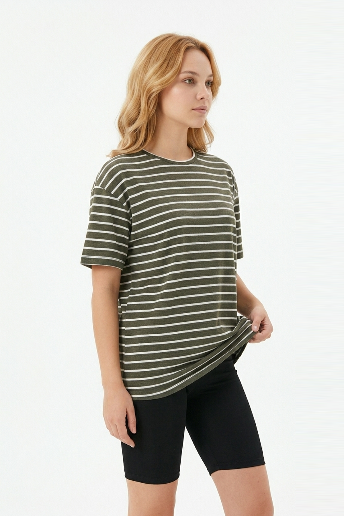 · Kadın yatay çizgili bisiklet yaka slim fit tişört, modern ve şık tasarımıyla günlük kombinlerin vazgeçilmez parçasıdır;