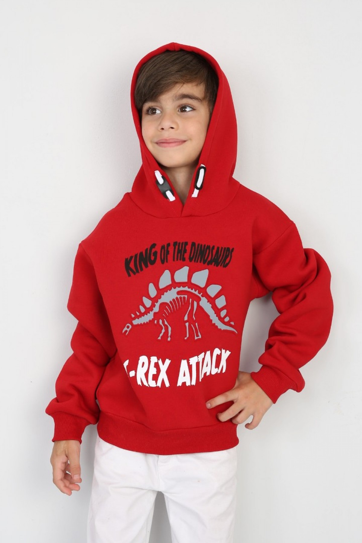 Üç İplik Şardonlu Baskılı Kapşonlu Kırmızı Sweat